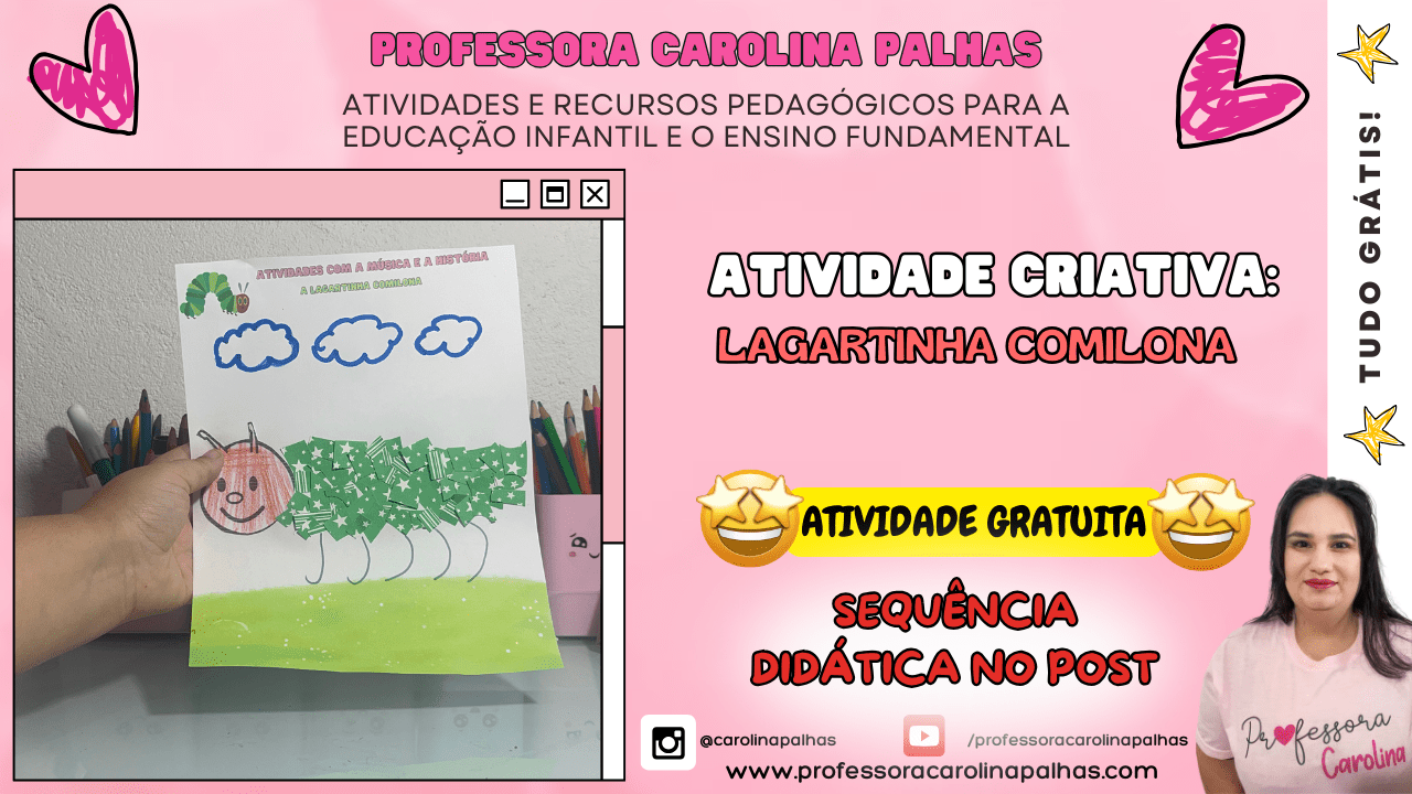 Palavras-chave: Lagartinha Comilona, atividade infantil, música educativa, história infantil, educação infantil, BNCC, sequência didática, desenvolvimento infantil, aprendizagem lúdica, professora Carolina Palhas