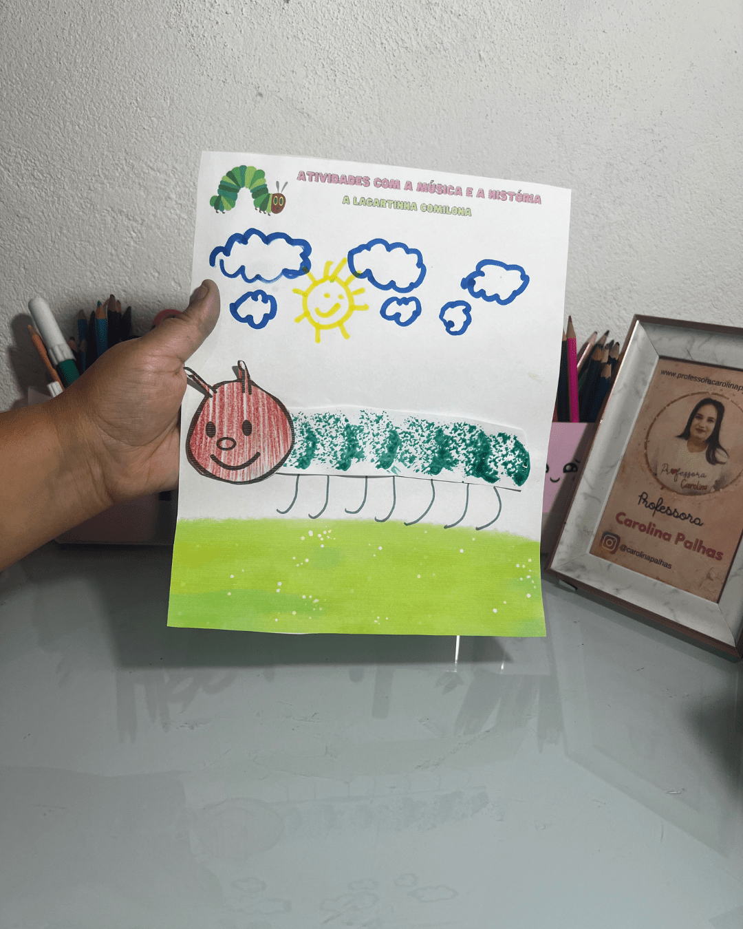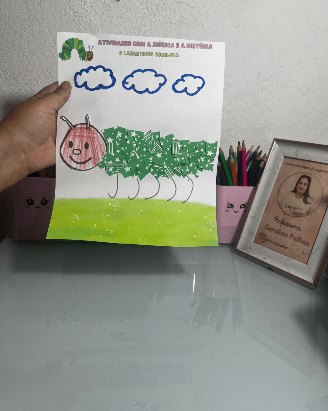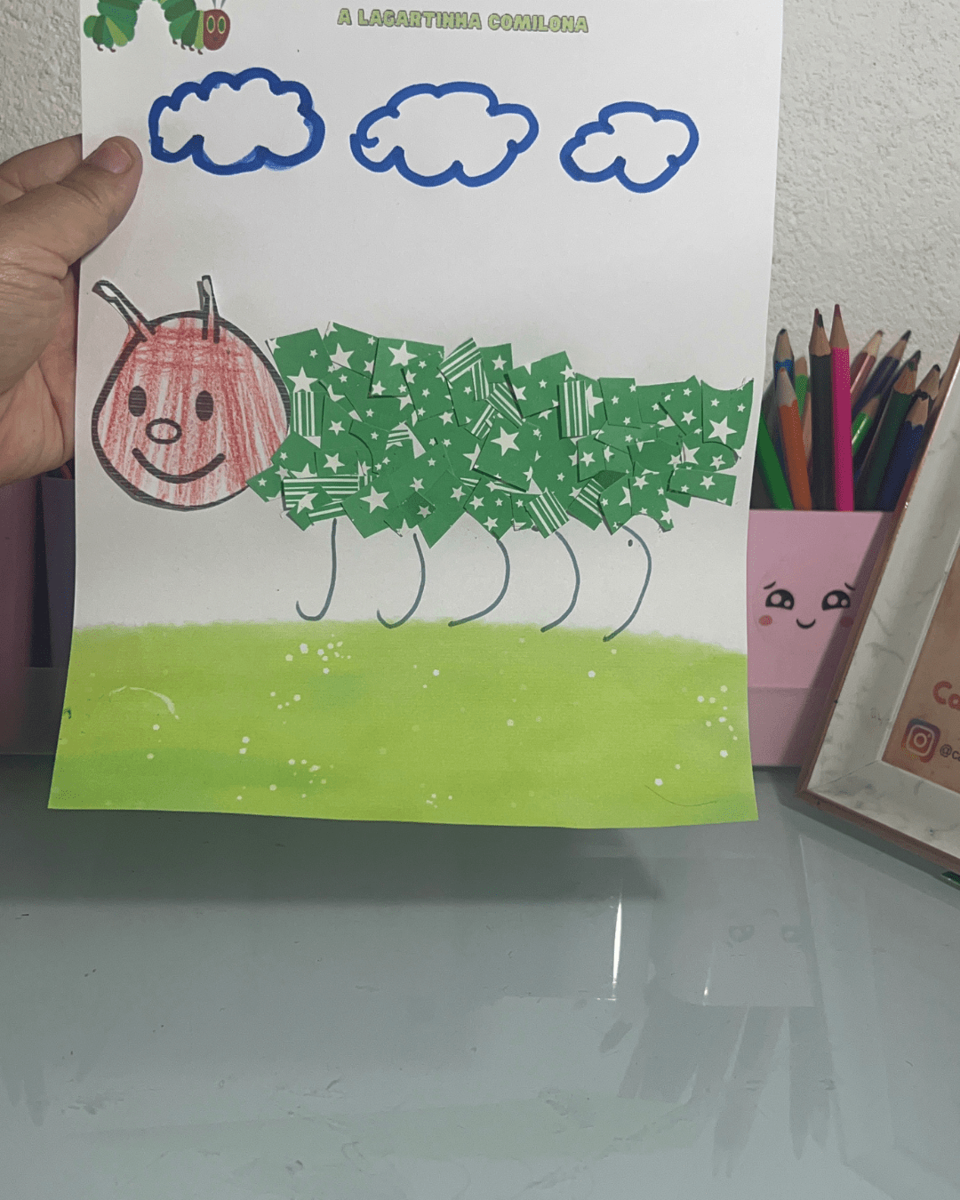 - Utilize materiais como papel, lápis de cor, e tinta para criar uma lagartinha colorida.