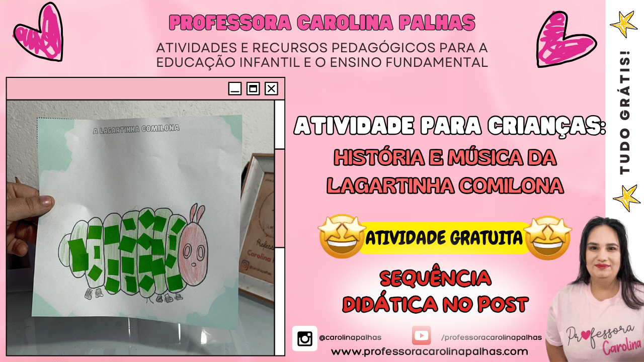Palavras-chave: Lagartinha Comilona, atividade infantil, música educativa, história infantil, educação infantil, BNCC, sequência didática, desenvolvimento infantil, aprendizagem lúdica, professora Carolina Palhas