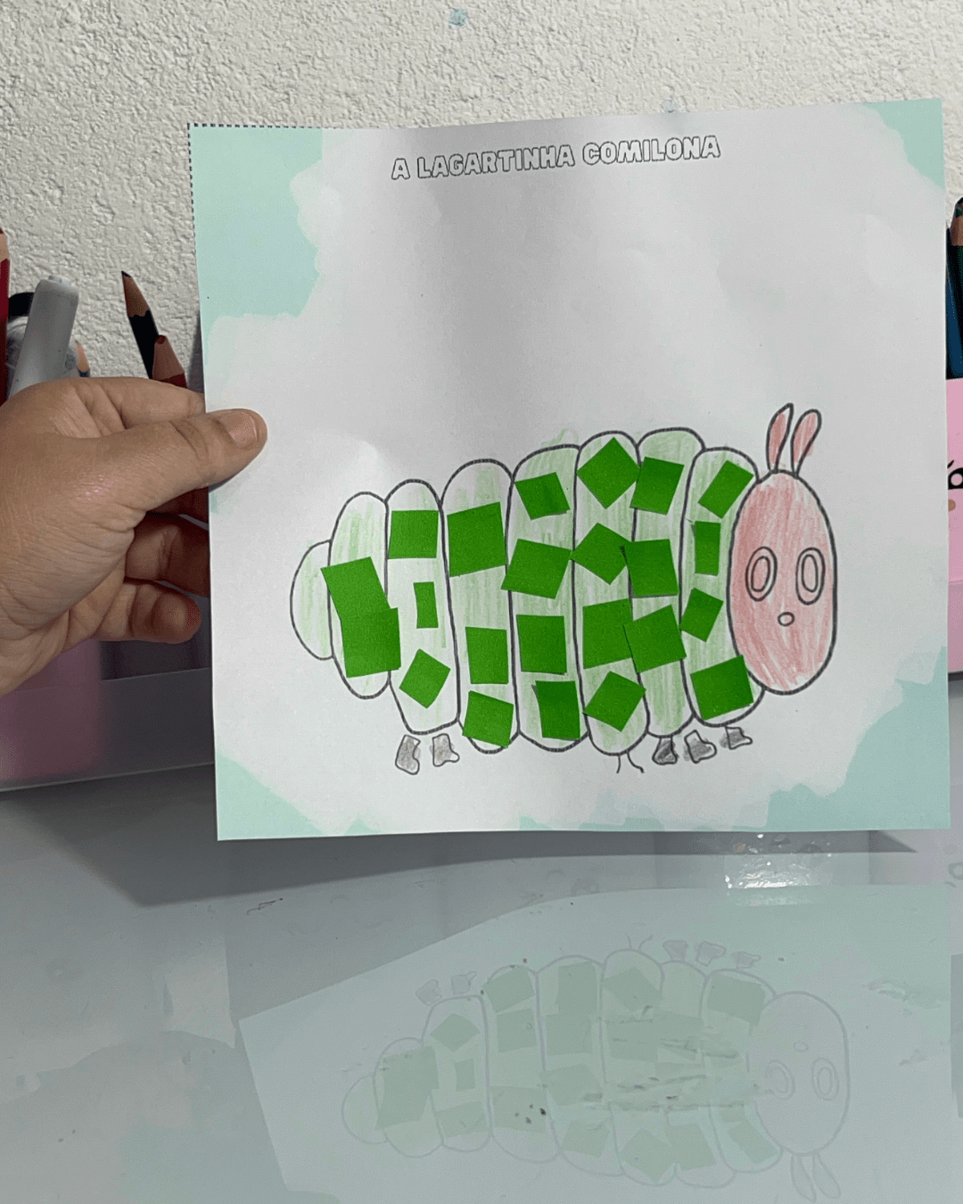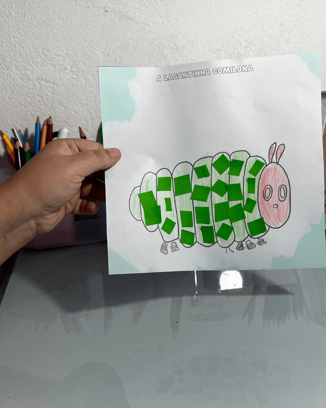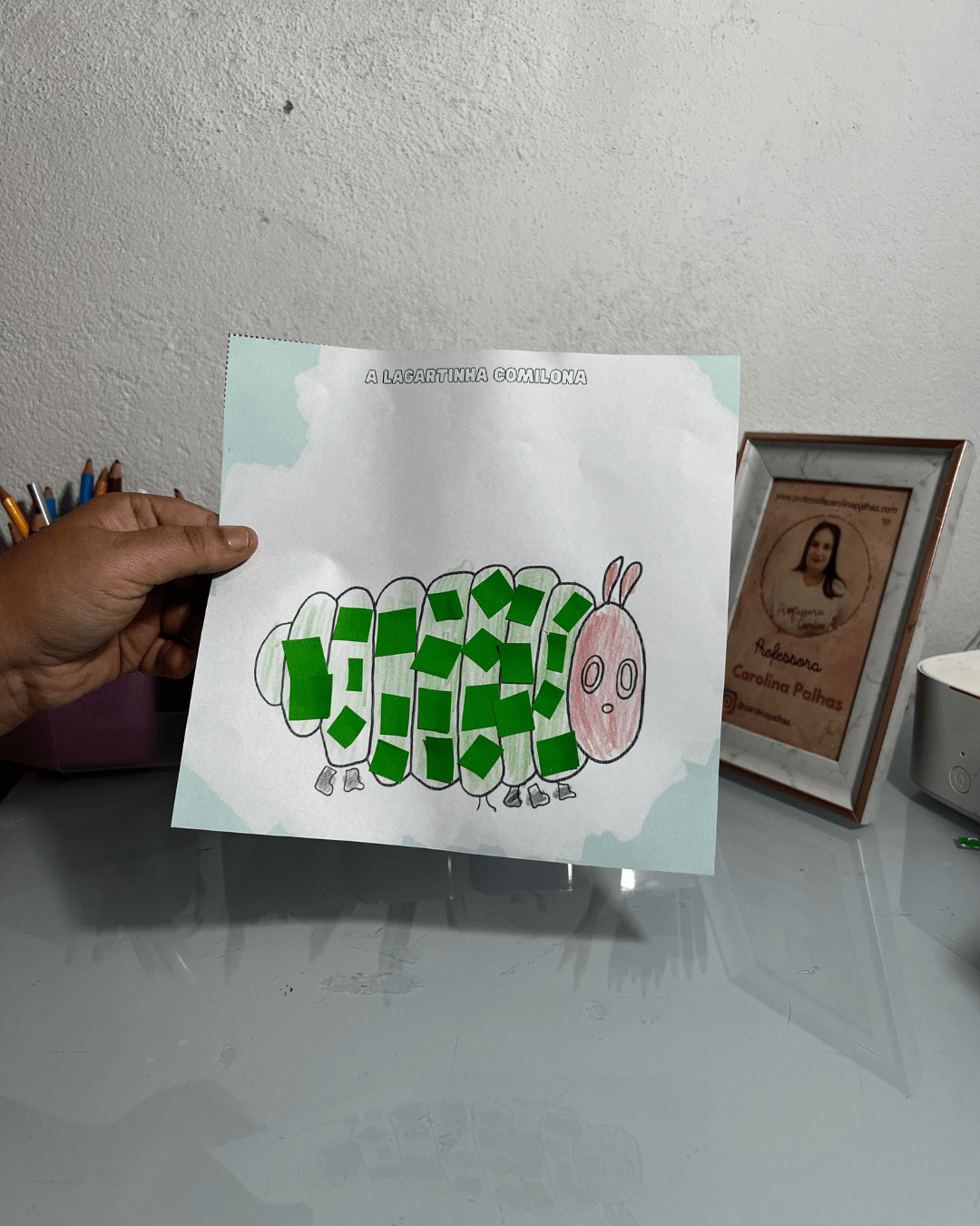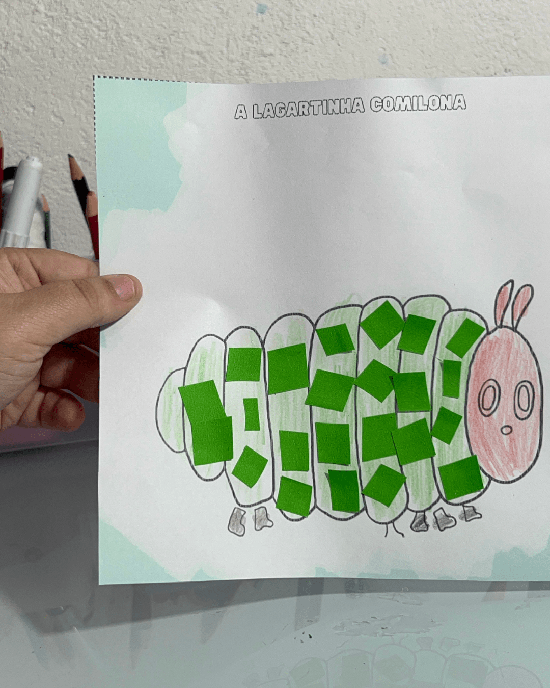 - Utilize materiais como papel, lápis de cor, e tinta para criar uma lagartinha colorida.
