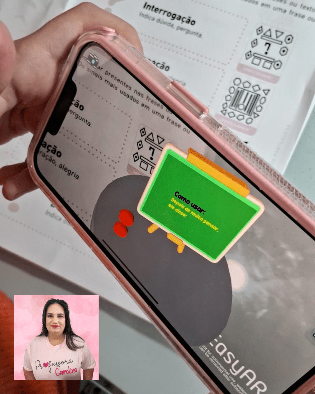 A realidade aumentada é uma tecnologia que adiciona elementos virtuais à nossa percepção da realidade. No caso dos sinais de pontuação, a dinâmica é simples e envolvente: primeiro, as crianças leem e identificam os sinais. Em seguida, com o uso de um aplicativo, esses sinais ganham vida! Basta escanear um QR code, e o sinal de pontuação salta na tela, tornando o aprendizado muito mais divertido e interativo.