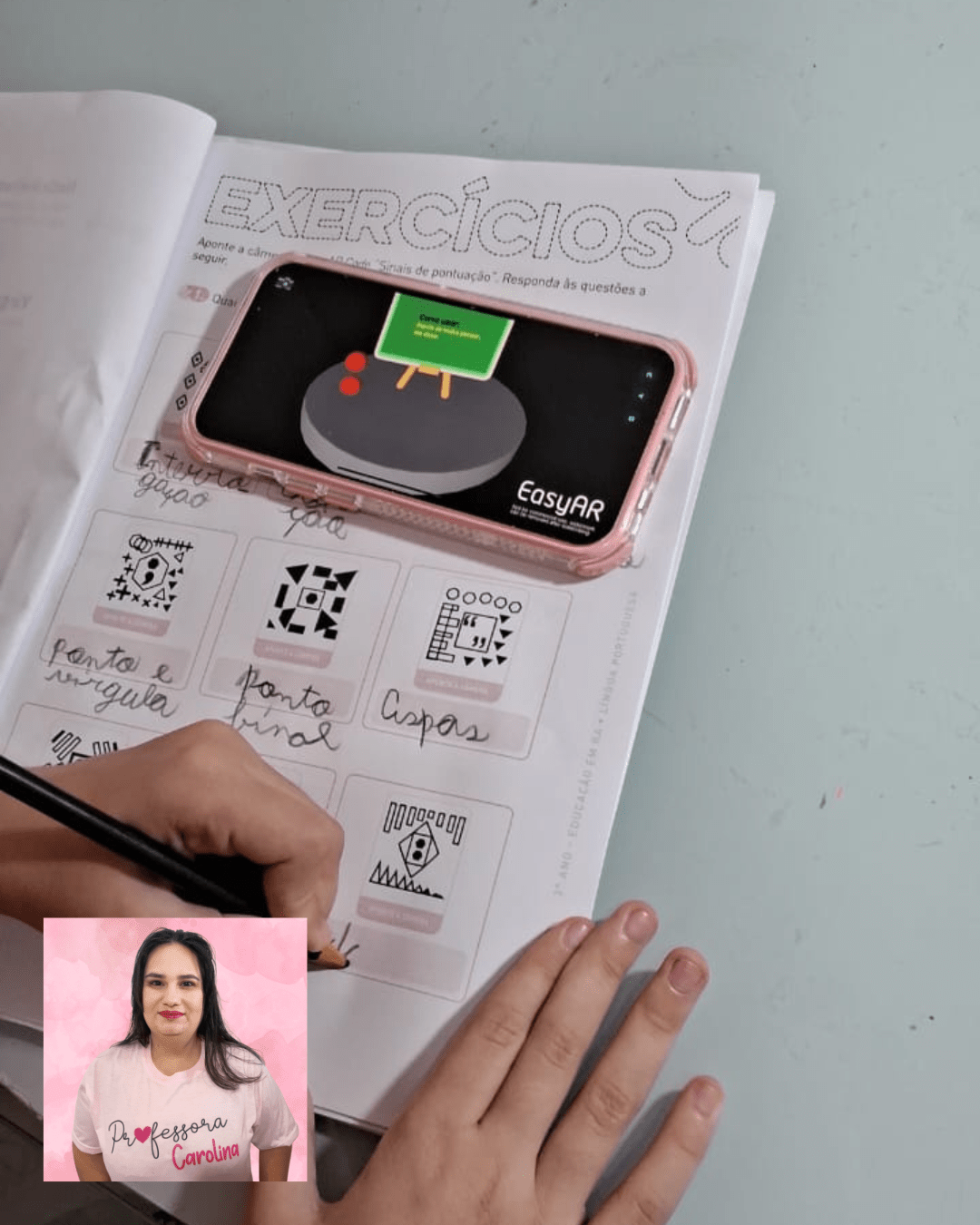 Após essa interação, os alunos realizam exercícios em que escaneiam novamente o QR code para visualizar o sinal de pontuação e escrevem seu nome no espaço indicado. Esse processo capta a atenção das crianças e as encanta, aumentando o interesse e a motivação para aprender. Além disso, a tecnologia da realidade aumentada se conecta perfeitamente com a linguagem das novas gerações de alunos, permitindo uma interação fluida entre o material impresso e o meio digital.