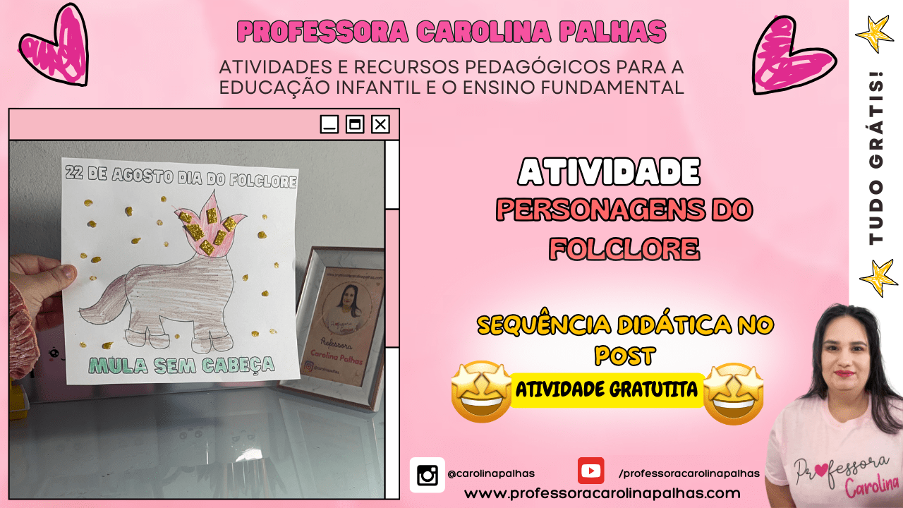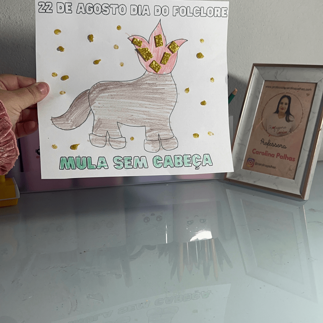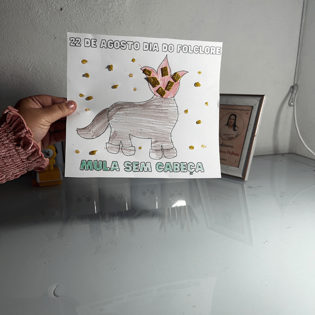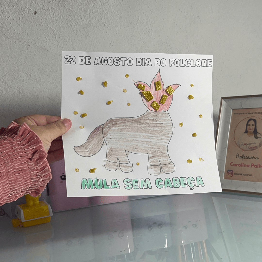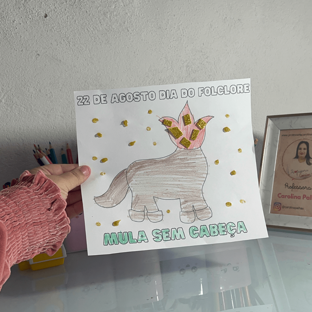 - Texto: “Nesse Dia do Folclore, vamos explorar as lendas brasileiras com a Mula Sem Cabeça. Crie, decore e aprenda sobre essa personagem mítica. Sequência didática completa no post e atividade gratuita!”