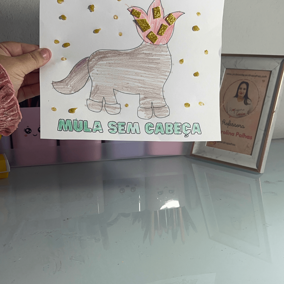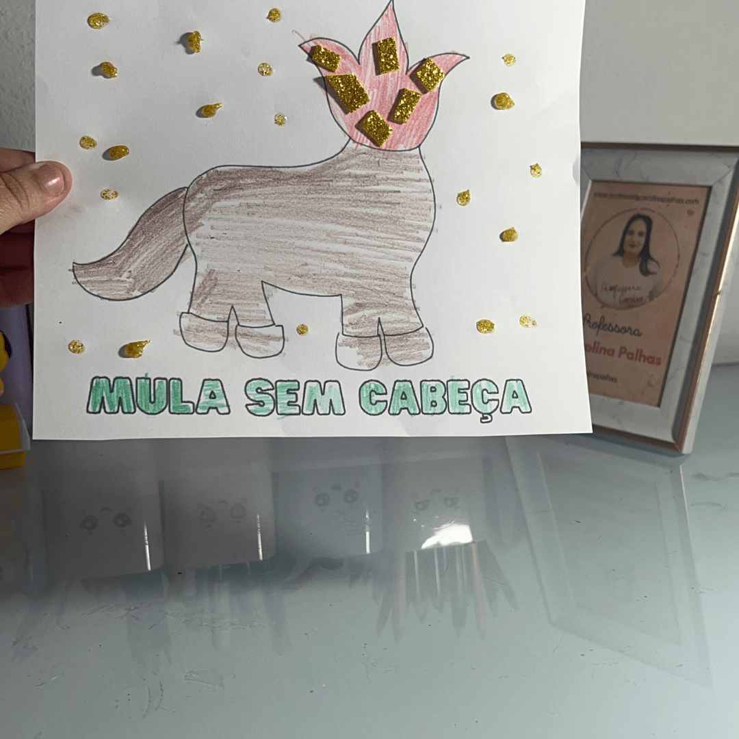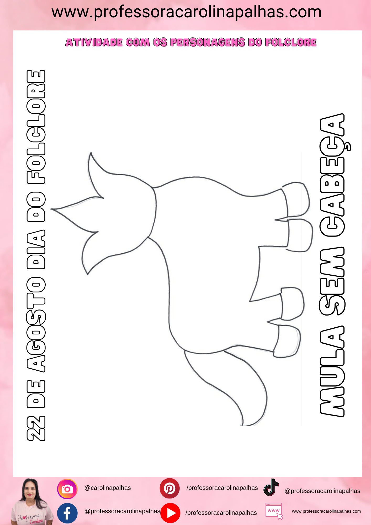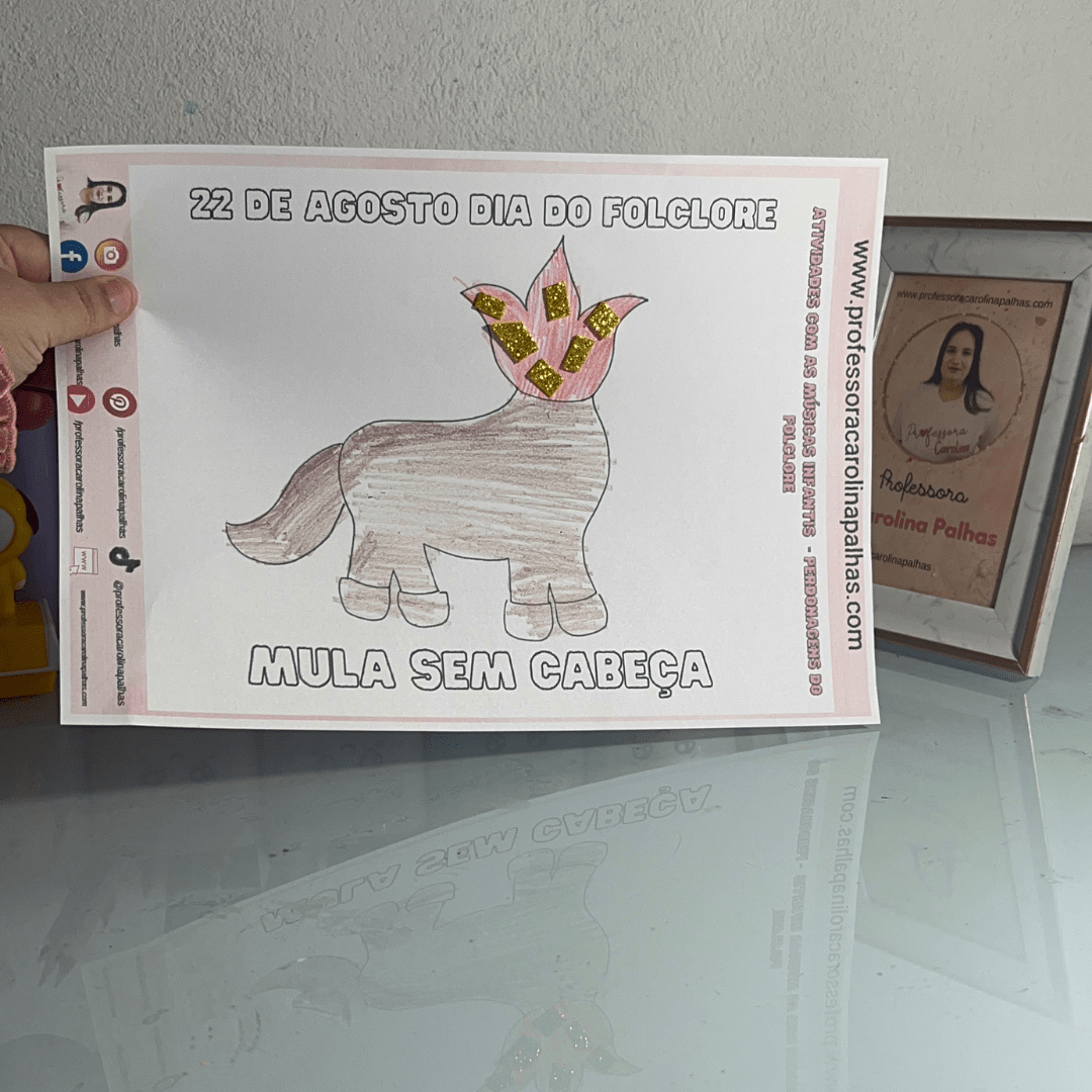 - Texto: “Nesse Dia do Folclore, vamos explorar as lendas brasileiras com a Mula Sem Cabeça. Crie, decore e aprenda sobre essa personagem mítica. Sequência didática completa no post e atividade gratuita!”