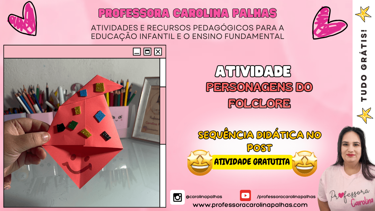 - Texto: “Explore o mundo mágico do Saci Pererê com essa dobradura divertida. Uma ótima maneira de ensinar folclore de forma interativa. Sequência didática no post, atividade gratuita!