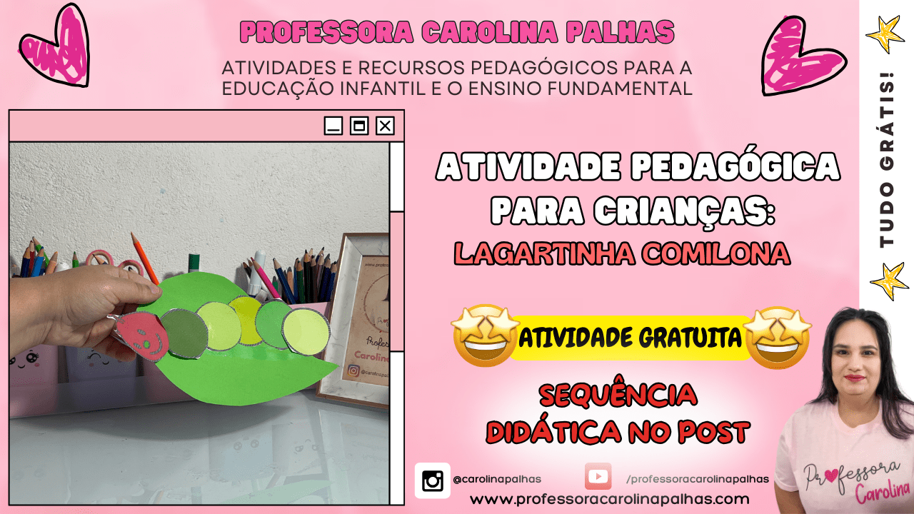 Palavras-chave: Lagartinha Comilona, atividade infantil, música educativa, história infantil, educação infantil, BNCC, sequência didática, desenvolvimento infantil, aprendizagem lúdica, professora Carolina Palhas