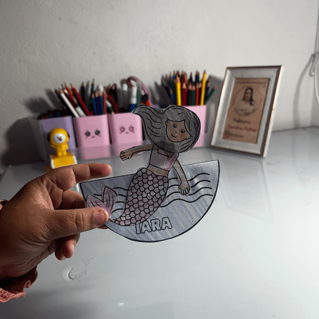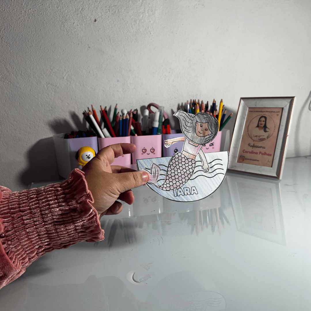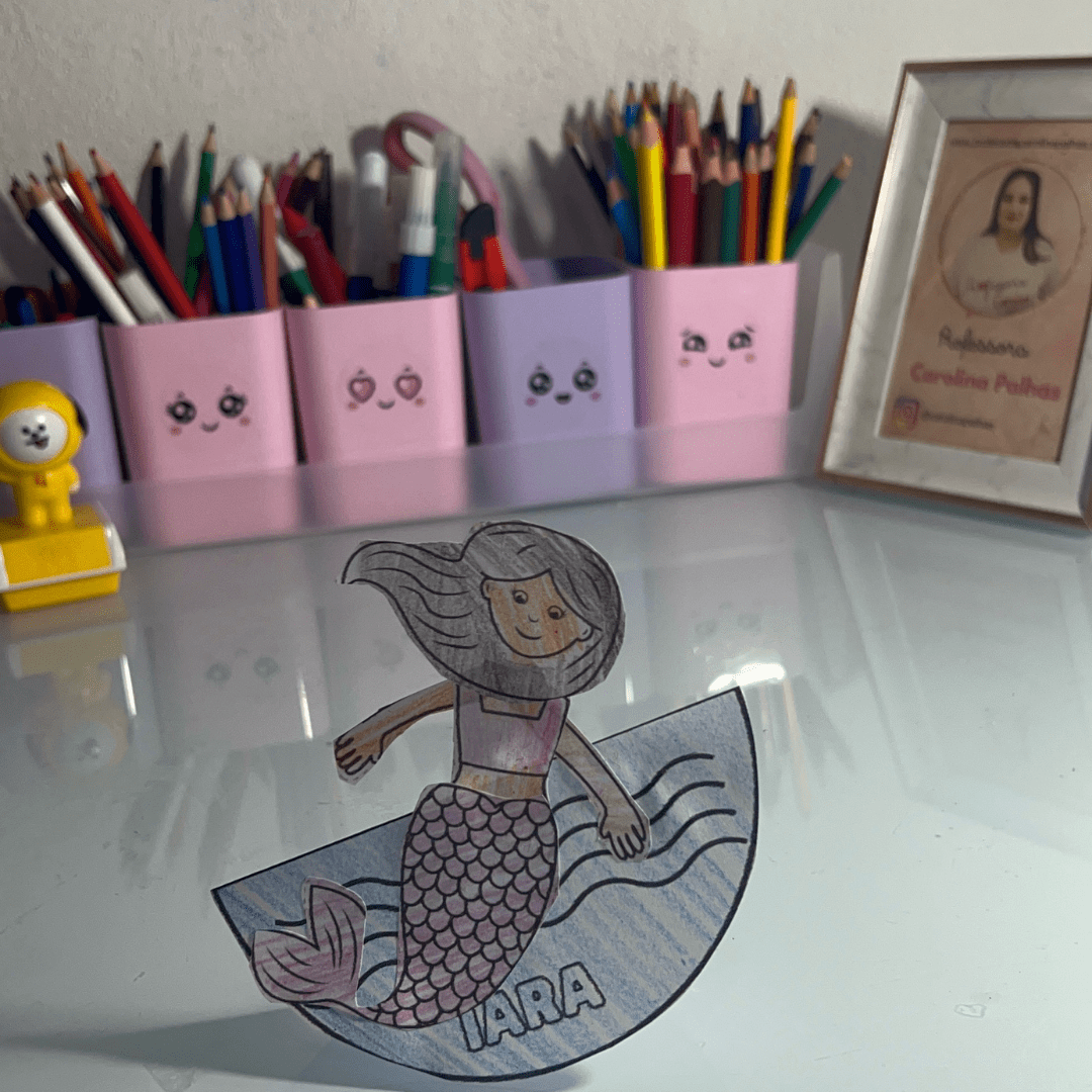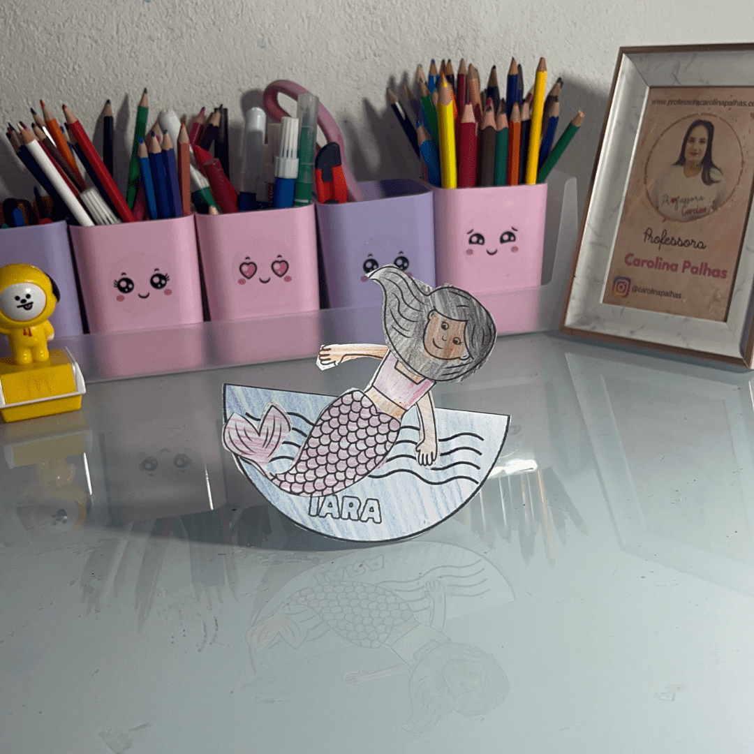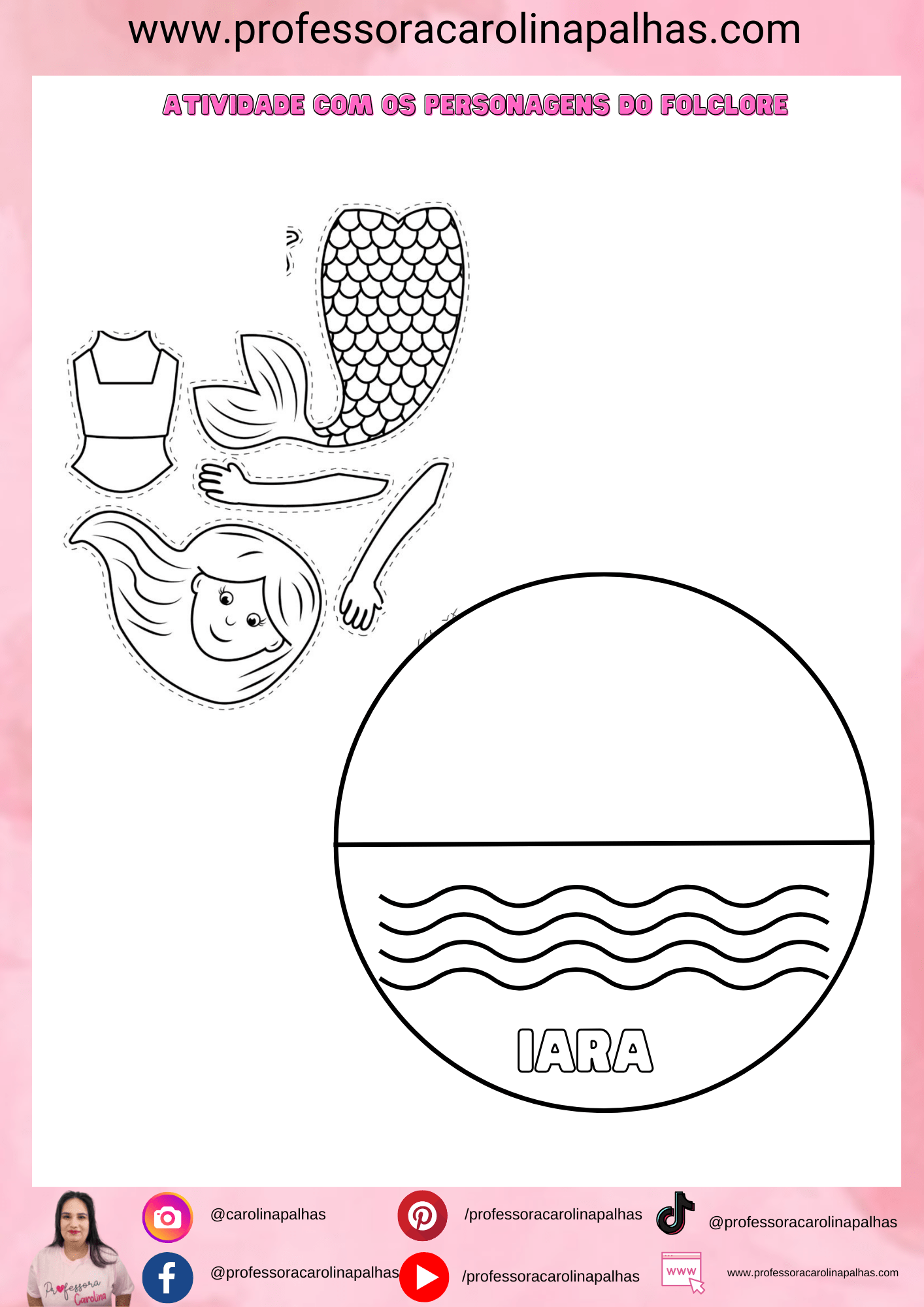 - Texto: “A Iara, a sereia dos rios brasileiros, é a estrela dessa atividade. Deixe as crianças soltarem a imaginação enquanto montam a sua própria Iara. Confira a sequência didática completa no post e aproveite a atividade gratuita!”