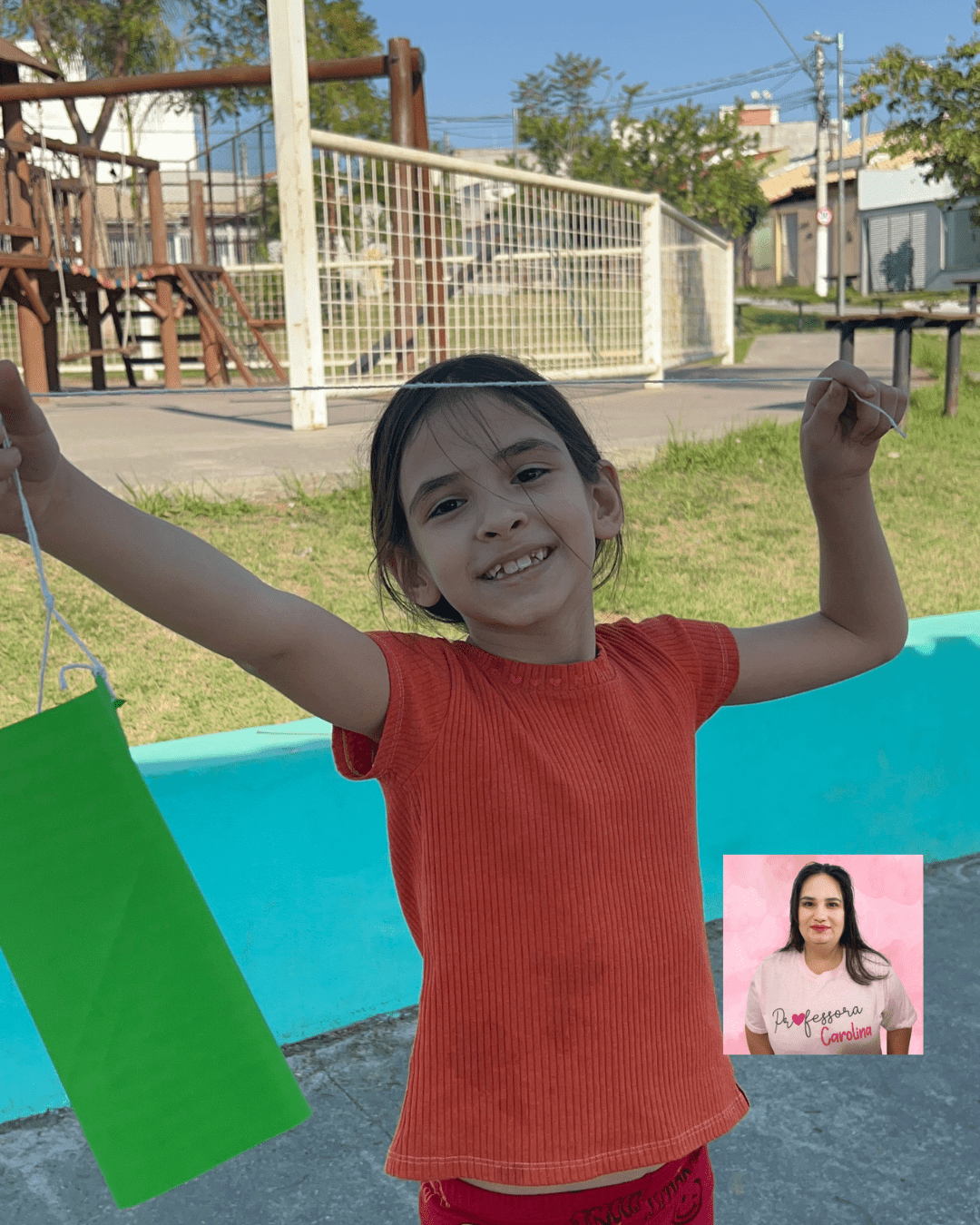 • Atividade: As crianças aprenderão a fazer suas próprias pipas através de dobraduras simples de papel. Após a construção, irão para o pátio para soltar as pipas e explorar o movimento delas ao vento.
