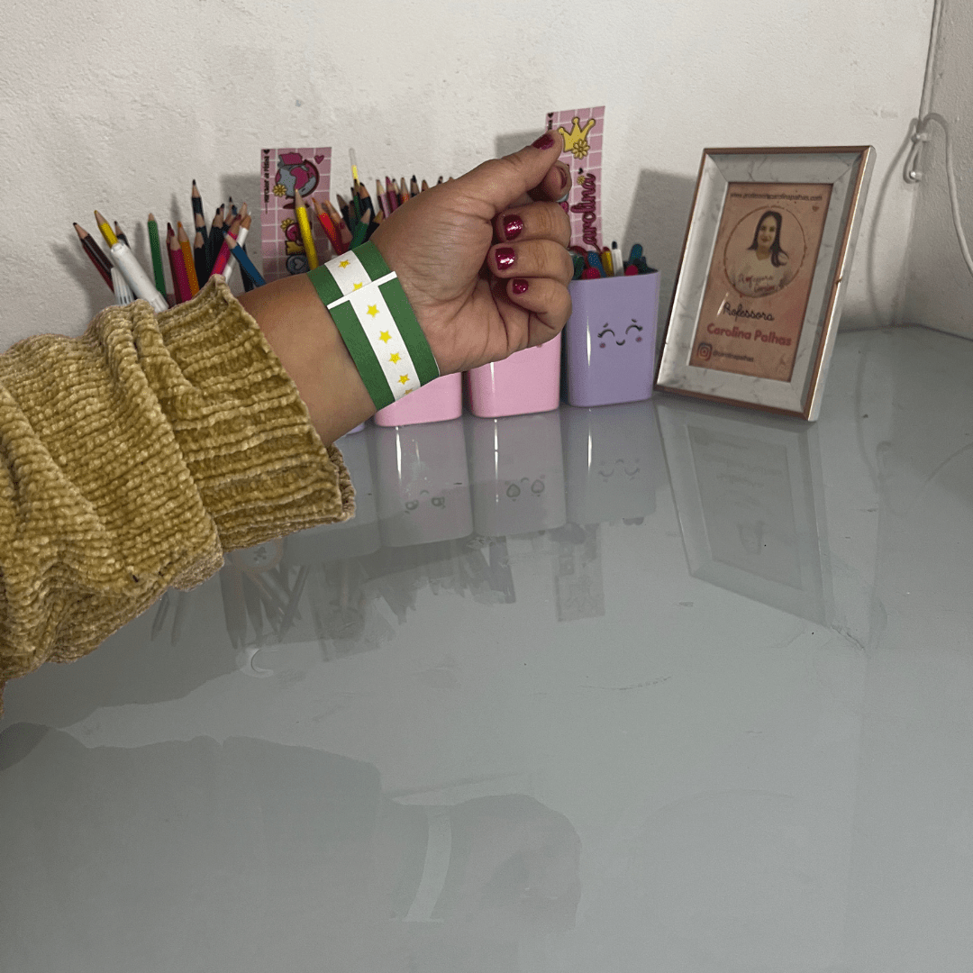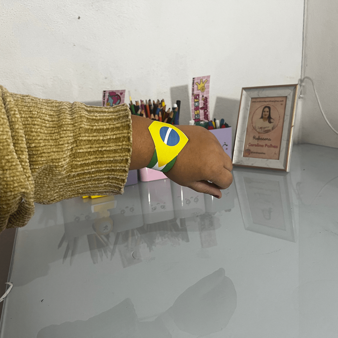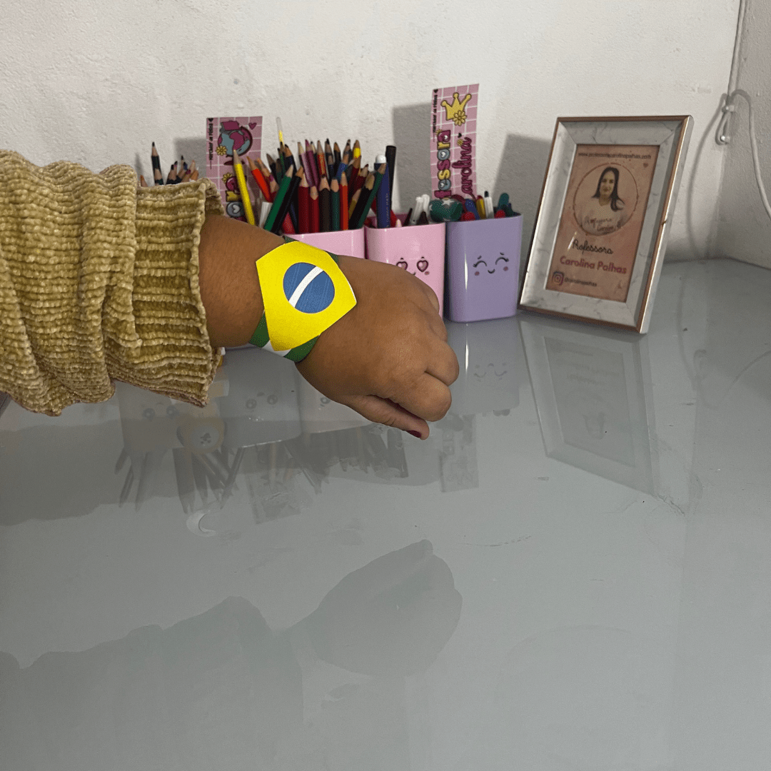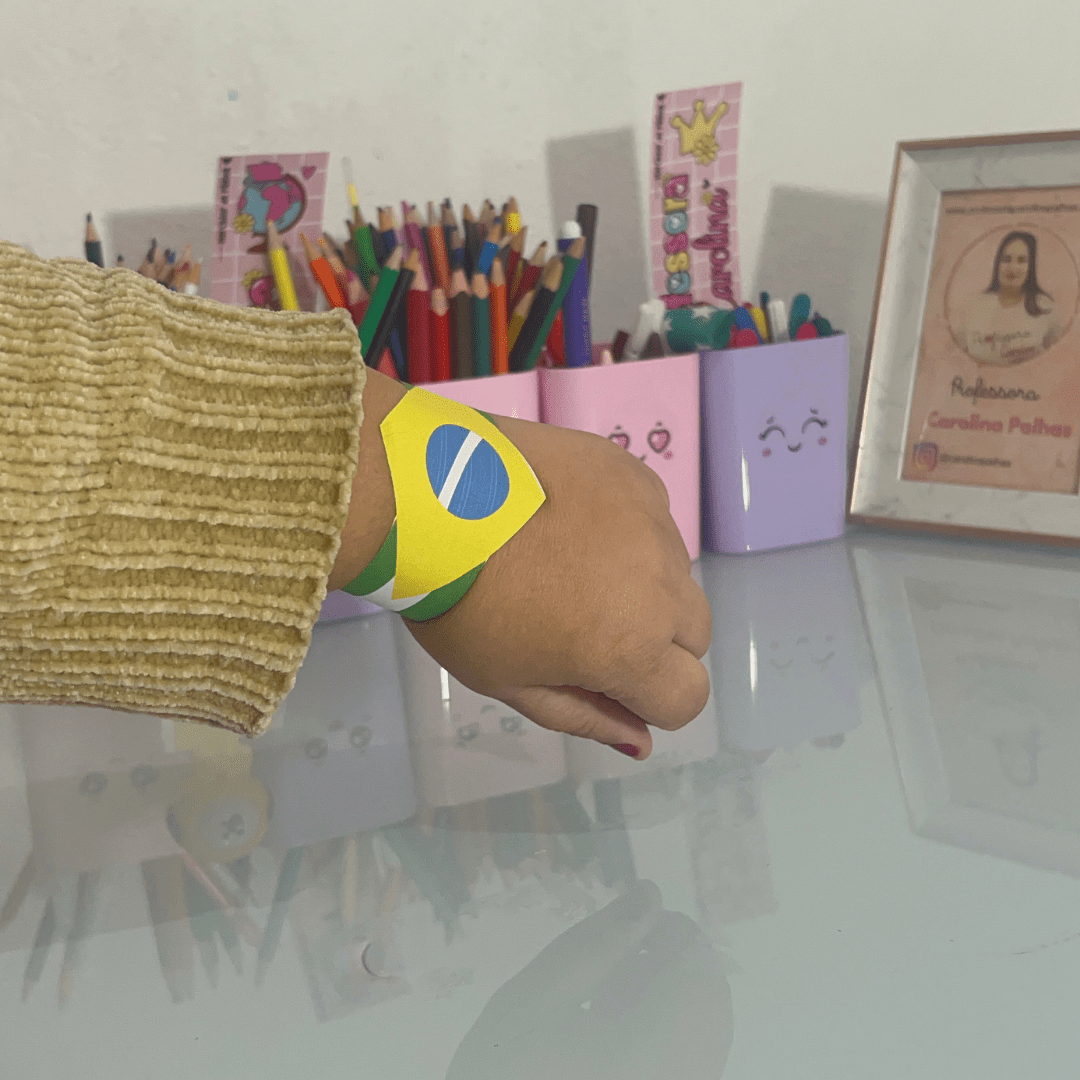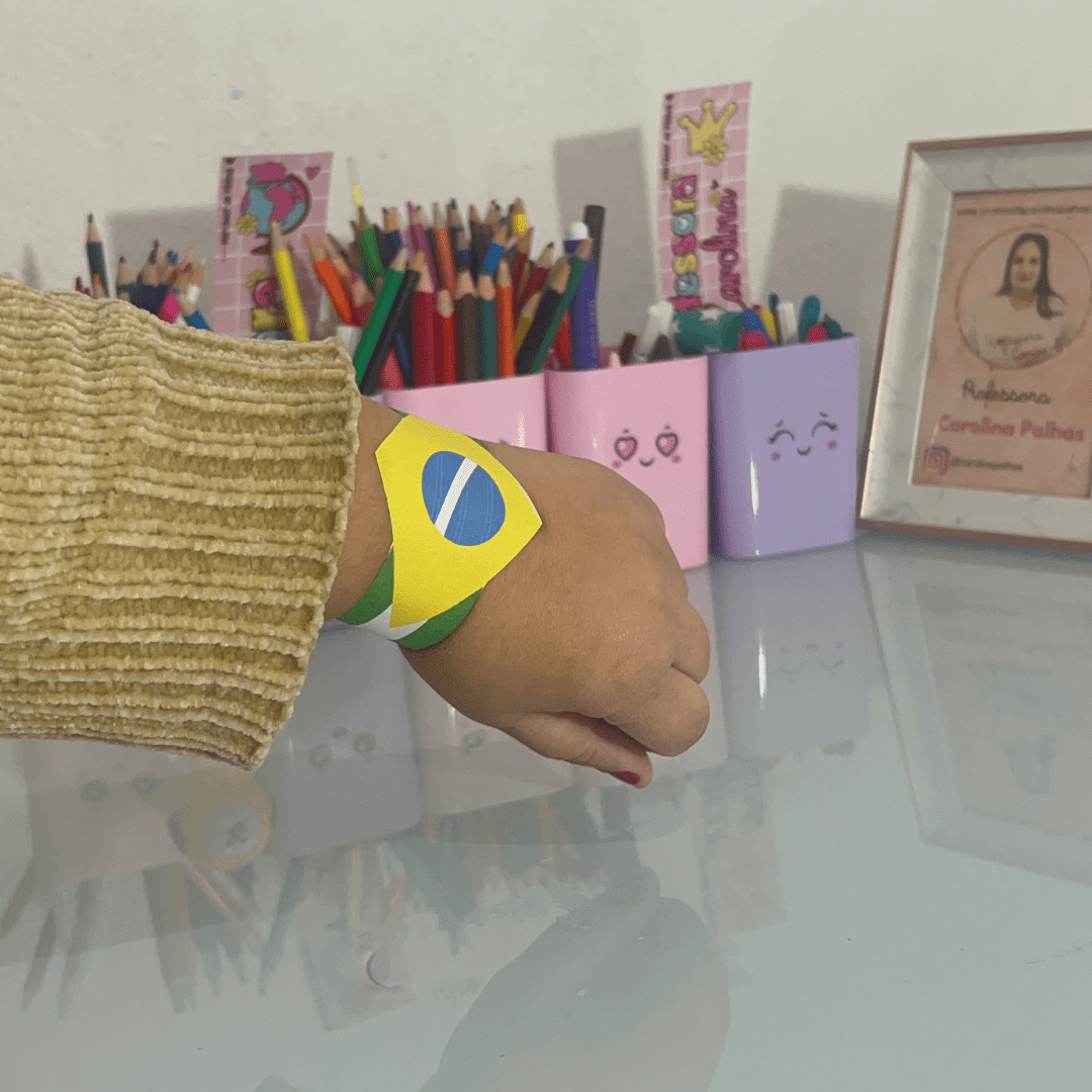 As crianças irão confeccionar pulseiras decoradas com a bandeira do Brasil, como na imagem em anexo. Elas podem colorir e recortar o modelo, colando a bandeira ao redor da pulseira de papel.- Campo de Experiência: Traços, sons, cores e formas.