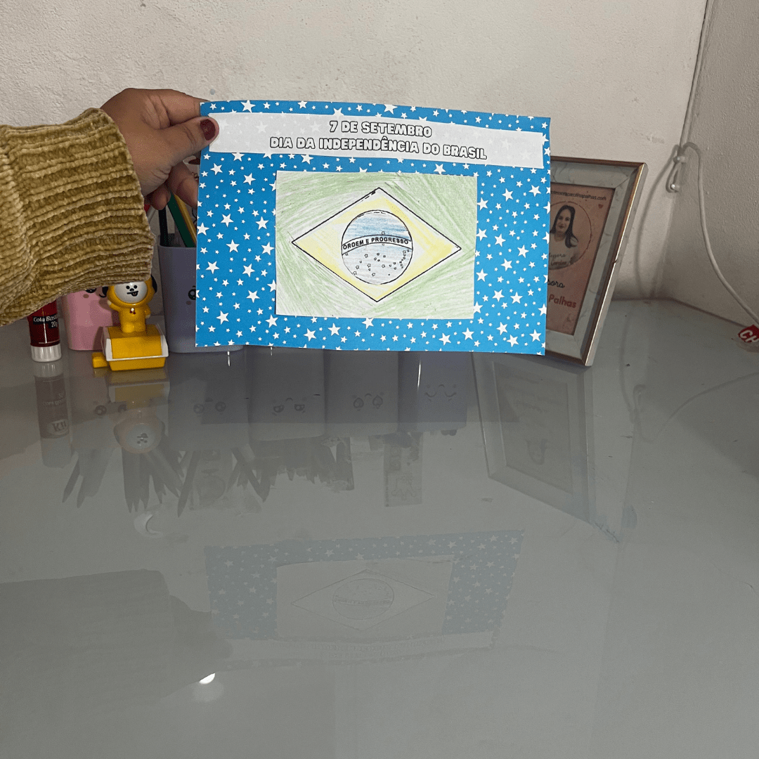 As crianças irão confeccionar a bandeira do Brasil, como a da imagem em anexo, colorindo e montando o símbolo nacional com papéis coloridos e materiais decorativos.- Campo de Experiência: Traços, sons, cores e formas.
