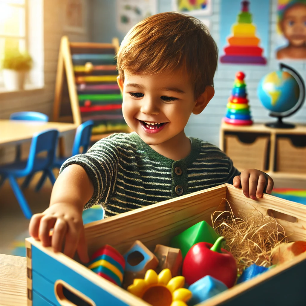 Fotografia de uma criança sorrindo enquanto coloca a mão em uma caixa colorida, explorando o objeto dentro dela.