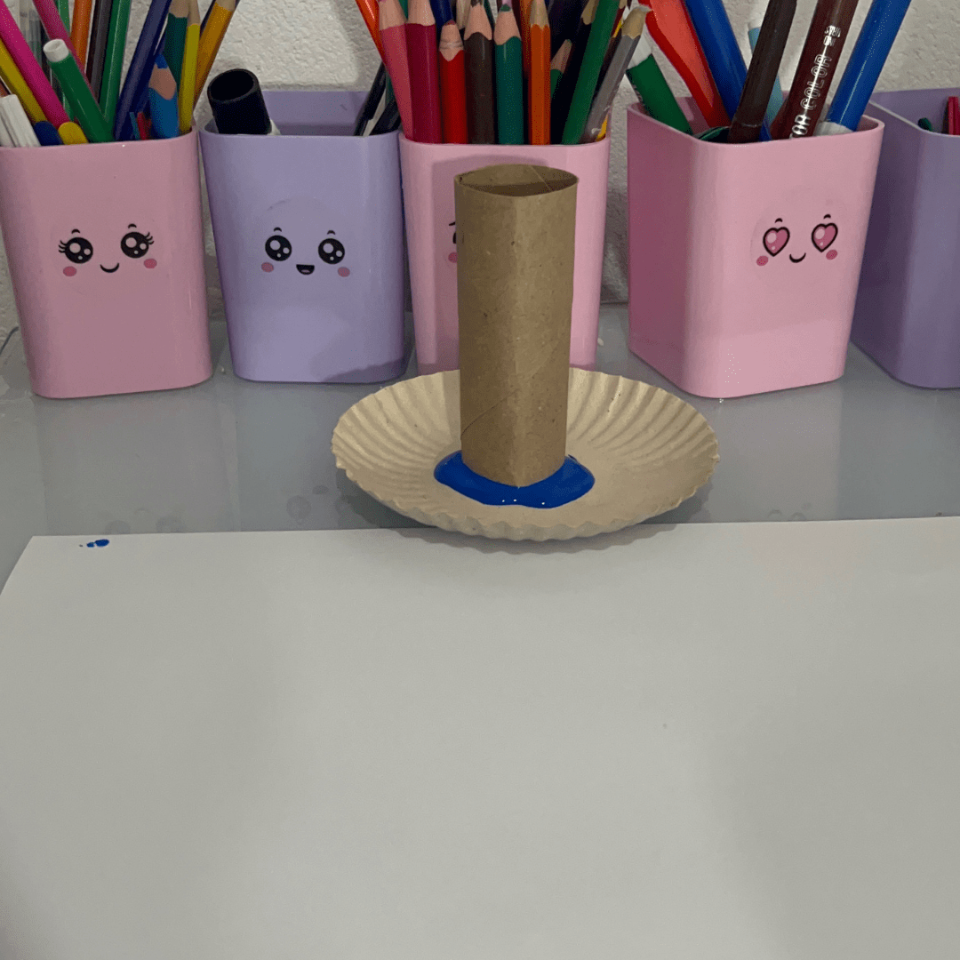 - No centro do prato de papel, faça um pequeno furo e insira o palito de churrasco.