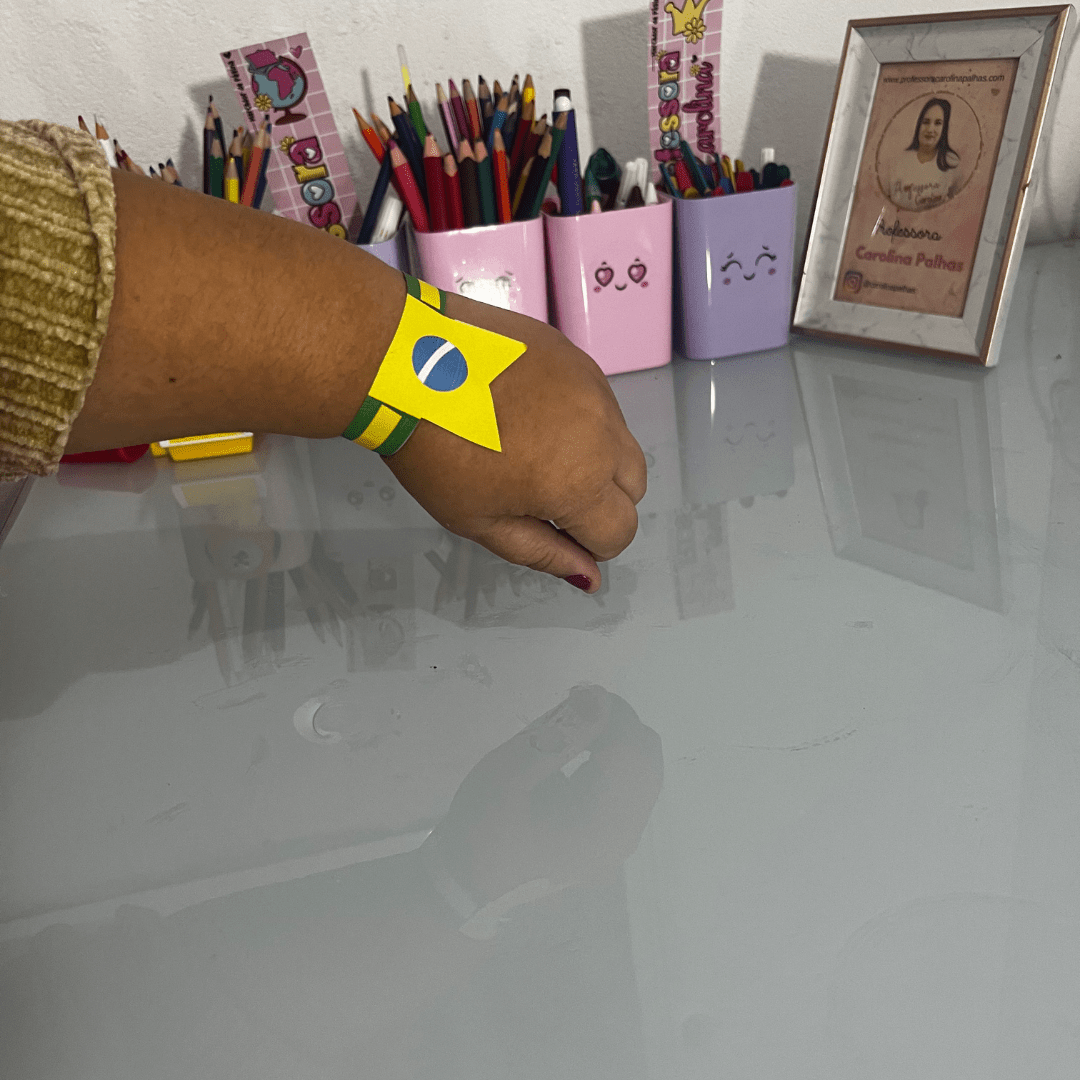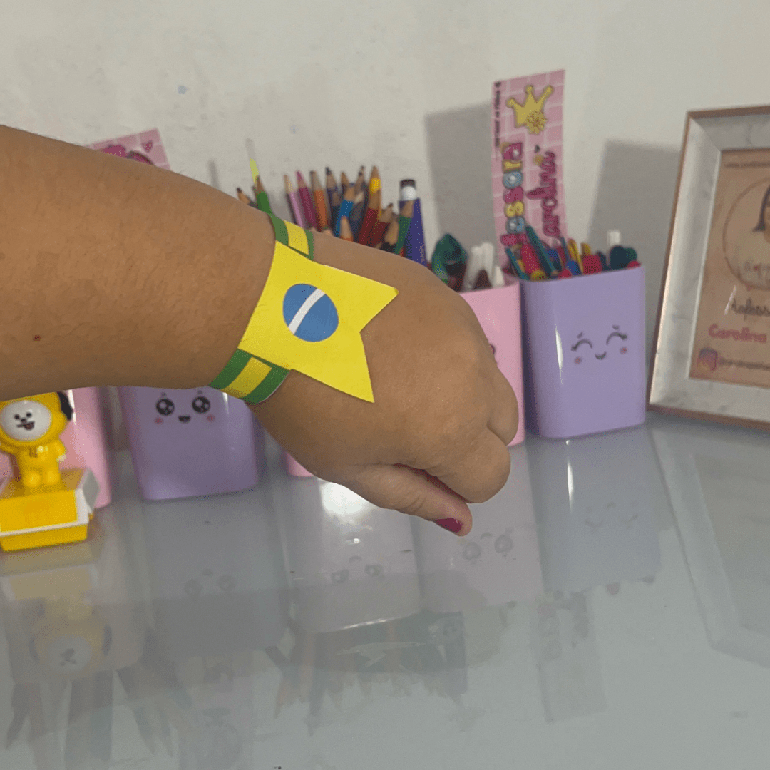 As crianças irão criar pulseiras temáticas com as cores e símbolos da bandeira do Brasil, como a da imagem. Usando papel colorido e materiais de fácil manuseio, esta atividade ajudará a desenvolver a coordenação motora e a criatividade.- Campo de Experiência: Traços, sons, cores e formas.