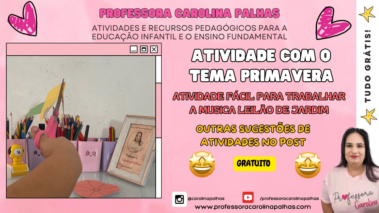Palavras-chave: coordenação motora, atividade de corte, primavera, educação infantil, leilão de jardim, música, flores, atividades manuais, desenvolvimento infantil