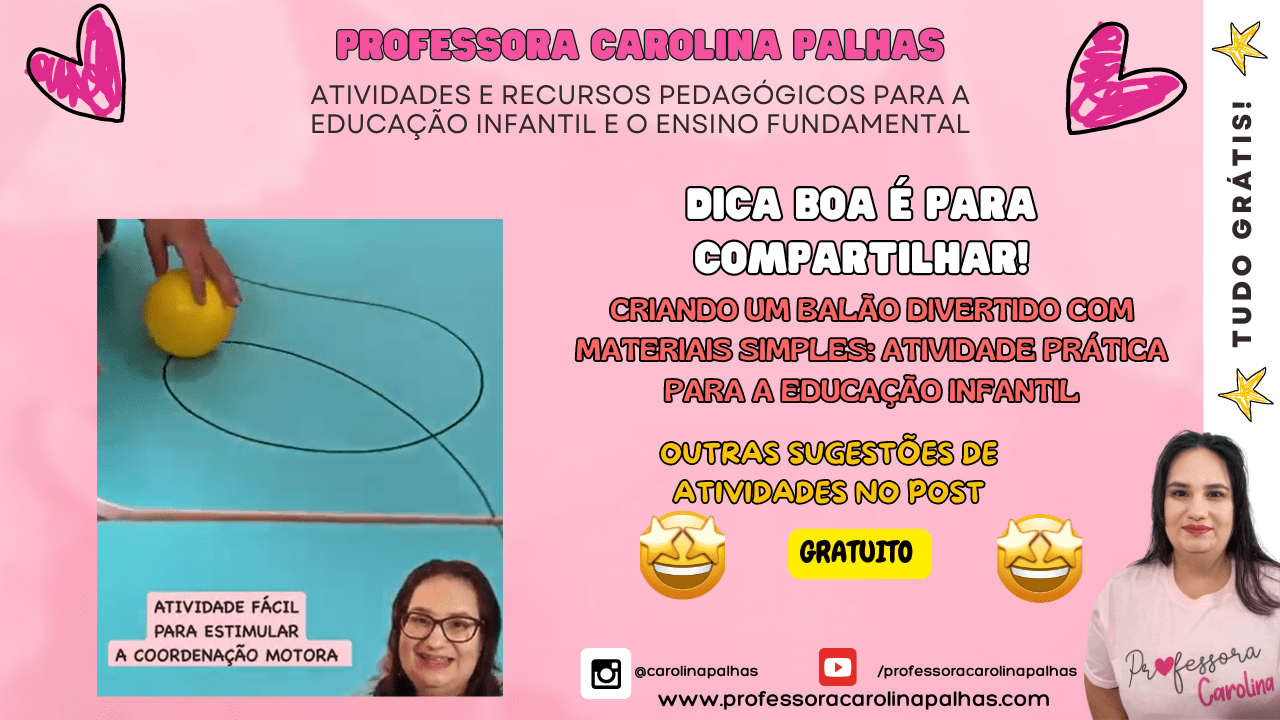 Professora Carolina Palhas é uma entusiasta da educação infantil e tecnologia. Com mais de 11 anos de experiência, ela compartilha suas ideias e planos pedagógicos em seu blog e Instagram, ajudando professores e mães a promoverem um aprendizado significativo e divertido para as crianças.