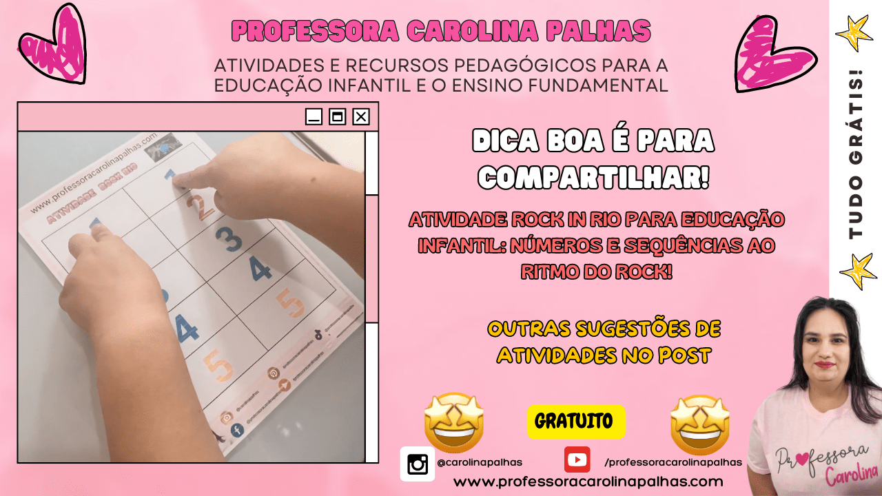 Hoje trago uma atividade super divertida e cheia de ritmo, inspirada no Rock in Rio, para trabalhar com as crianças da educação infantil! 🎸 Com a famosa batida da música “We Will Rock You,” conseguimos criar uma dinâmica que desenvolve não só a percepção musical, mas também o reconhecimento de números, coordenação motora, memória e sequência. Perfeita para envolver a criançada no aprendizado de uma maneira criativa e lúdica!