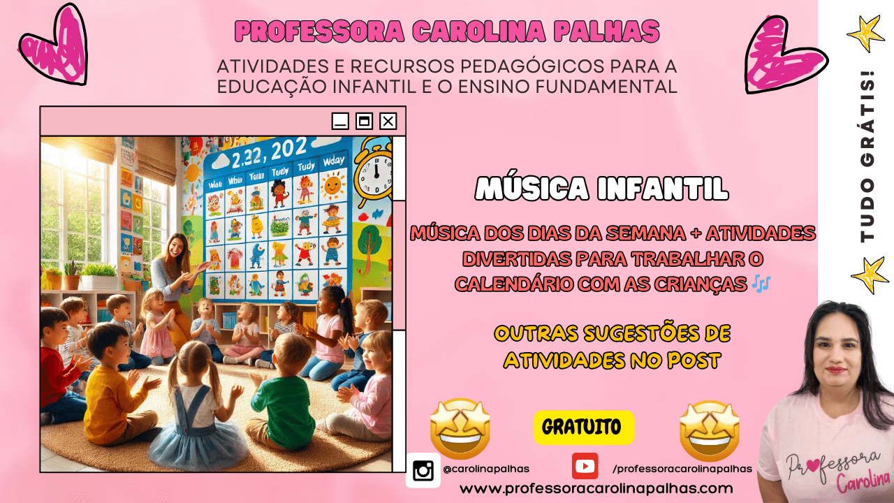Frases-chave: música inédita dos dias da semana, atividades lúdicas para o calendário, momento do calendário na educação infantil, coordenação motora com música, trabalhando dias da semana de forma divertida, atividades interativas com as crianças.