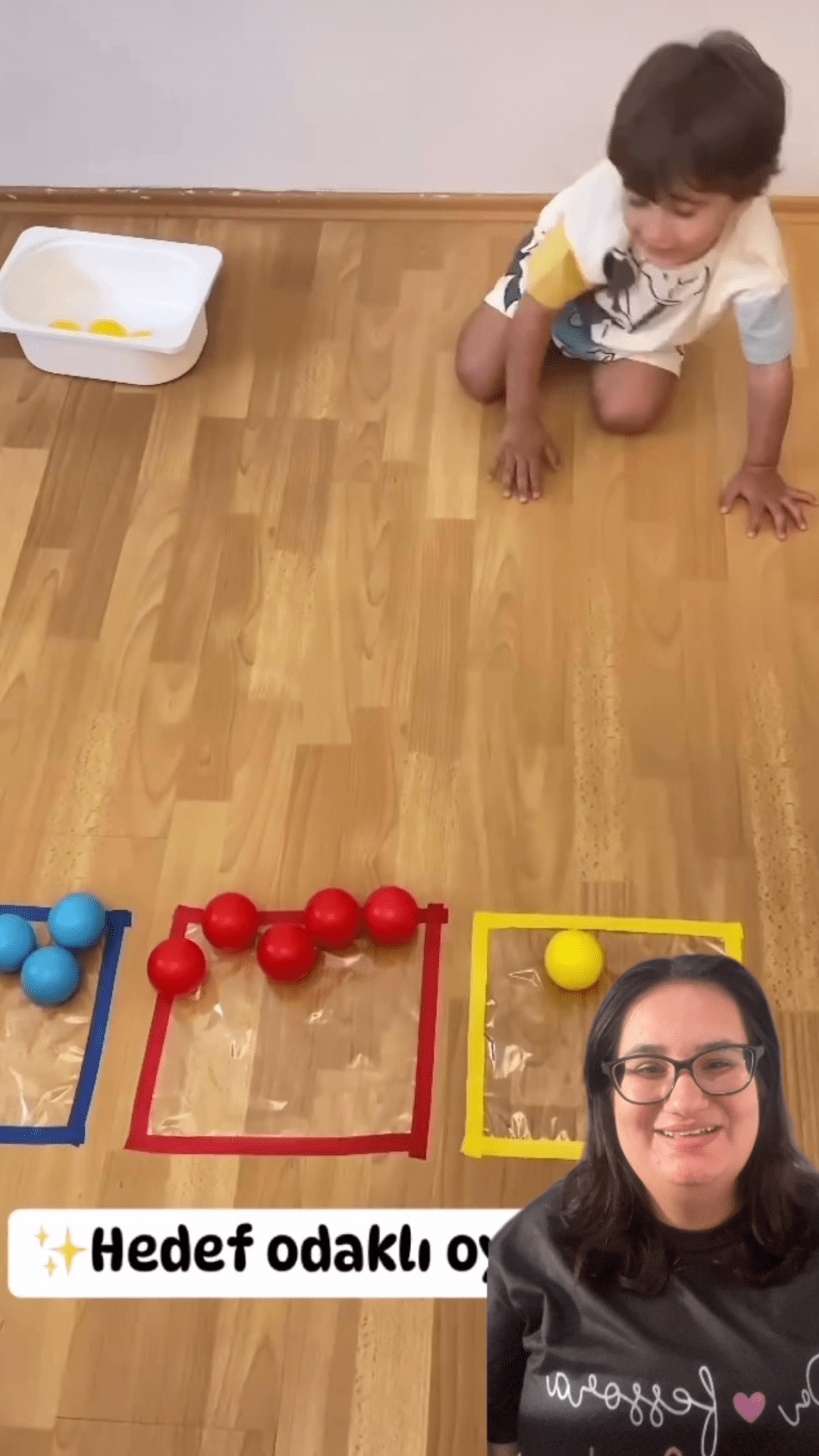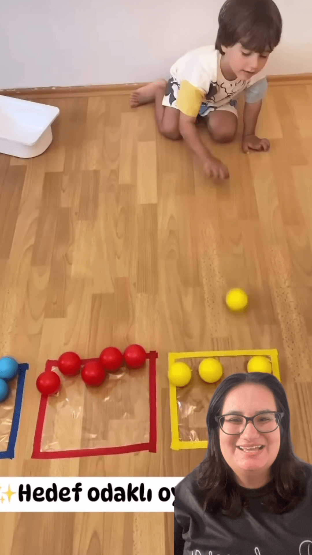 2. Pé com bolinha: As crianças devem empurrar as bolinhas usando os pés para o quadrado certo, o que estimula a coordenação motora ampla.