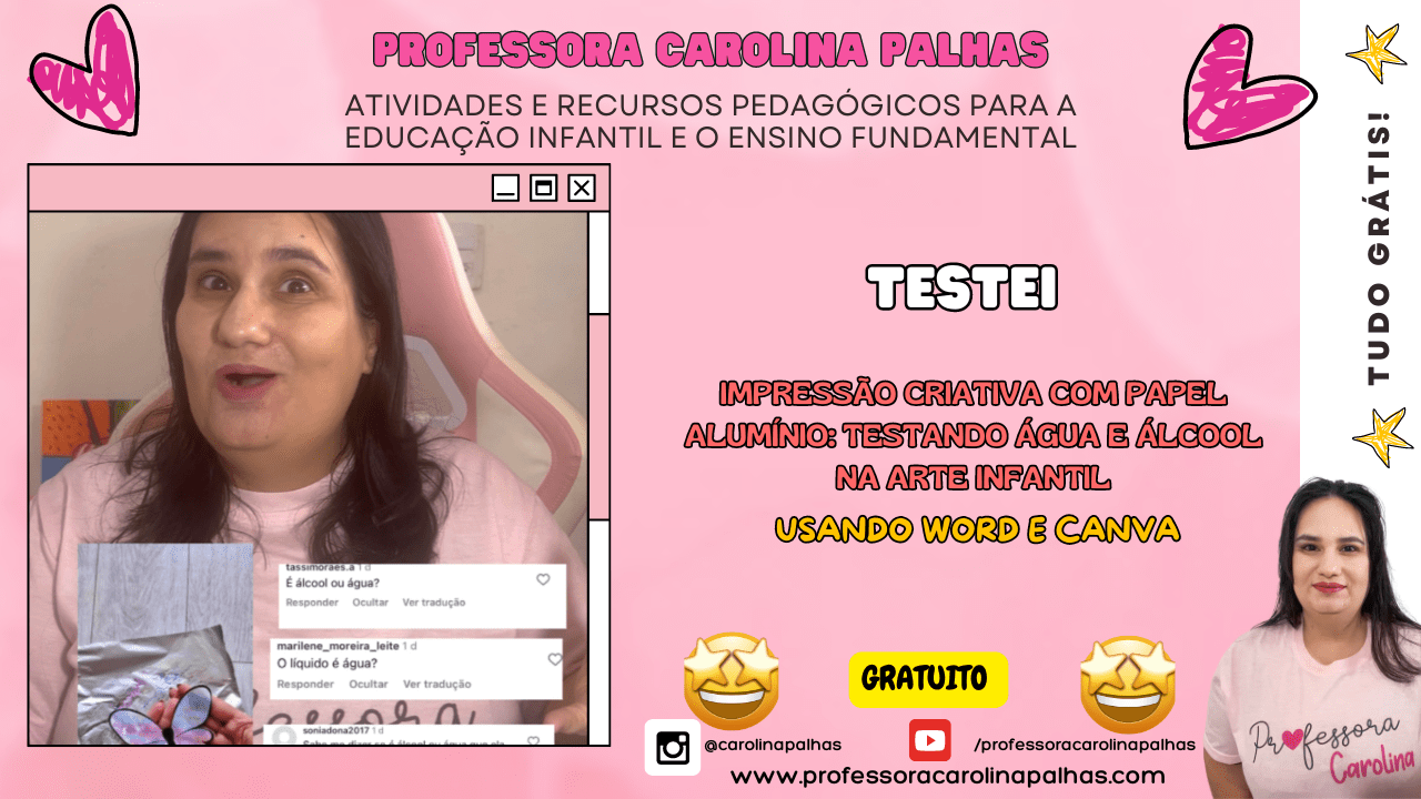 Conclusão: A atividade de impressão com papel alumínio é uma ótima maneira de estimular a criatividade e curiosidade das crianças, além de trabalhar habilidades motoras e a experimentação. Ao testar com água e álcool, a brincadeira se transforma em uma pequena descoberta científica, onde os pequenos podem observar as diferentes reações e resultados. Então, prepare os materiais e inspire-se a criar com seus alunos ou filhos, porque a arte também é um espaço para explorar o novo e o inesperado!