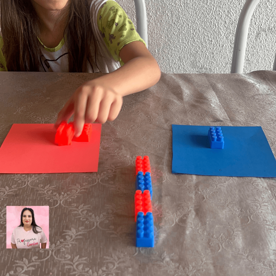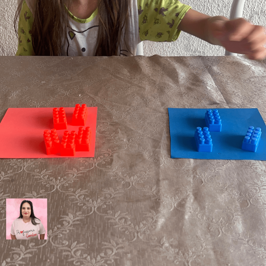 - Peça para as crianças organizarem os blocos vermelhos na folha vermelha e os blocos azuis na folha azul.
