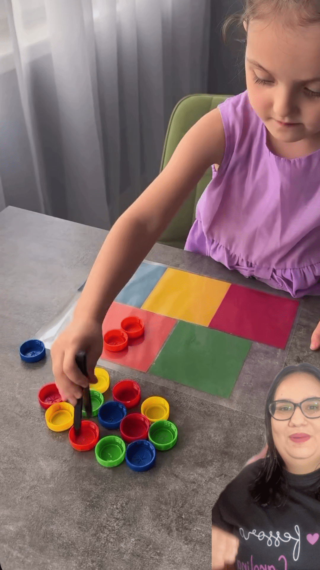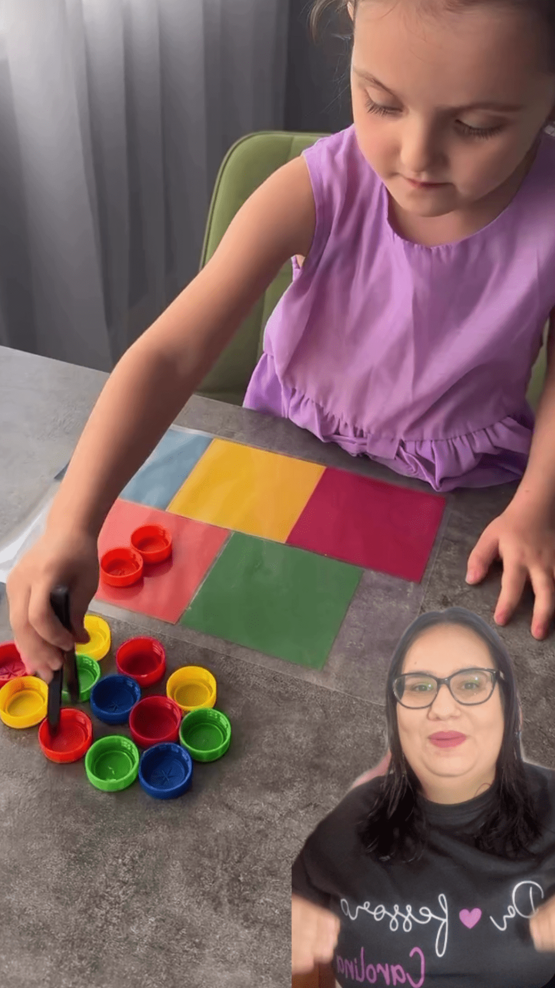 5. Jogo de correspondência: As crianças devem combinar as tampinhas com cartões de cores.