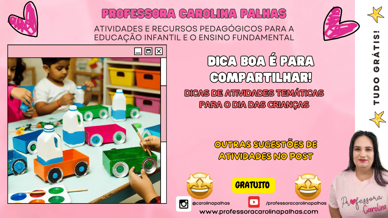 Professora Carolina Palhas é uma entusiasta da  educação infantil e tecnologia. Com mais de 11 anos de experiência, ela compartilha suas ideias e planos pedagógicos em seu blog e Instagram, ajudando professores e mães a promoverem um aprendizado significativo e divertido para as crianças.