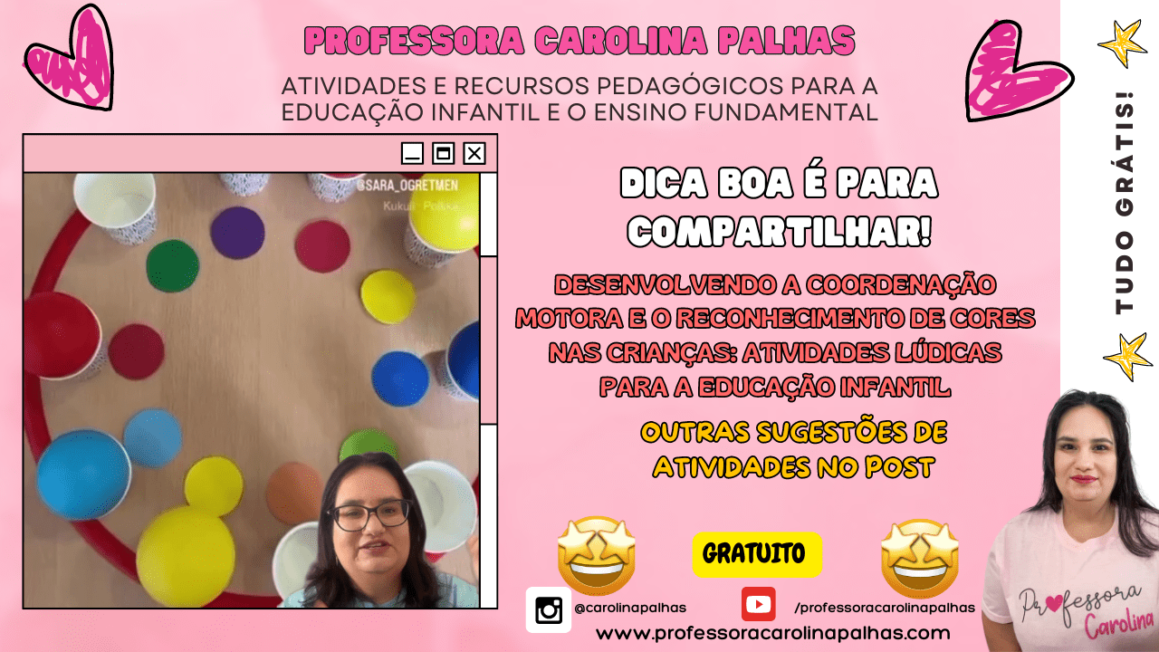 Palavras-chave: coordenação motora, atividades lúdicas, reconhecimento de cores, desenvolvimento infantil, educação infantil, brincadeiras educativas, aprendizado brincando, habilidades motoras, atividades pedagógicas, ensino lúdico, cores e formas, habilidades motoras finas, brincadeiras com copos, desenvolvimento cognitivo, práticas pedagógicas.