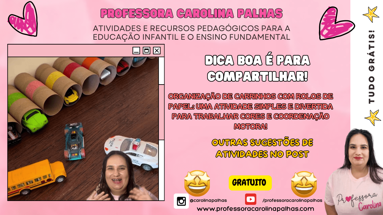 Palavras-chave: atividade educativa, carrinhos, coordenação motora, organização de brinquedos, Shopee, brincadeira criativa, cores, recurso pedagógico, reciclagem, aprendizado lúdico.
