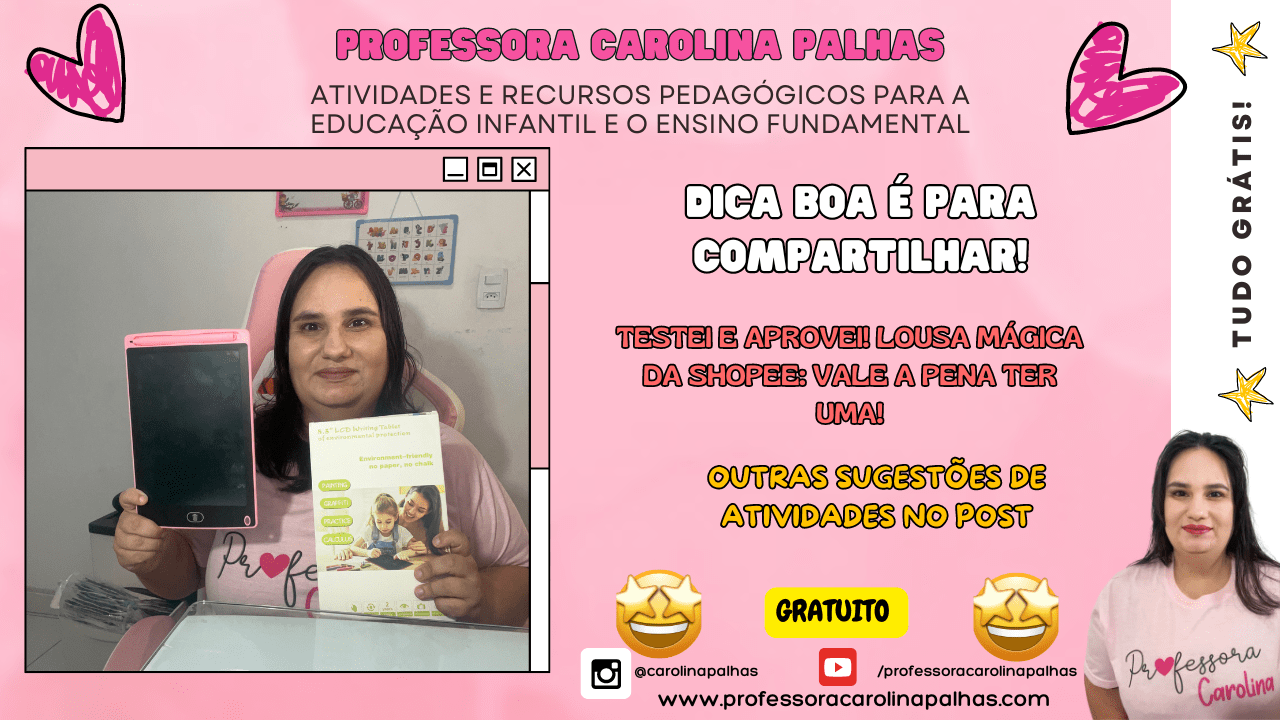 Na sala de aula, tenho utilizado a lousa para atividades rápidas como jogo da velha, desenhos livres e até para ensinar o alfabeto. As crianças ficam encantadas com a simplicidade e facilidade de uso. 🌟 E para quem deseja testar, aqui está o link para adquirir a sua: Lousa Mágica na Shopee.