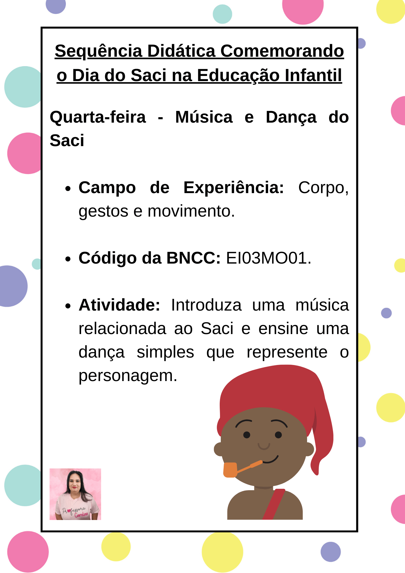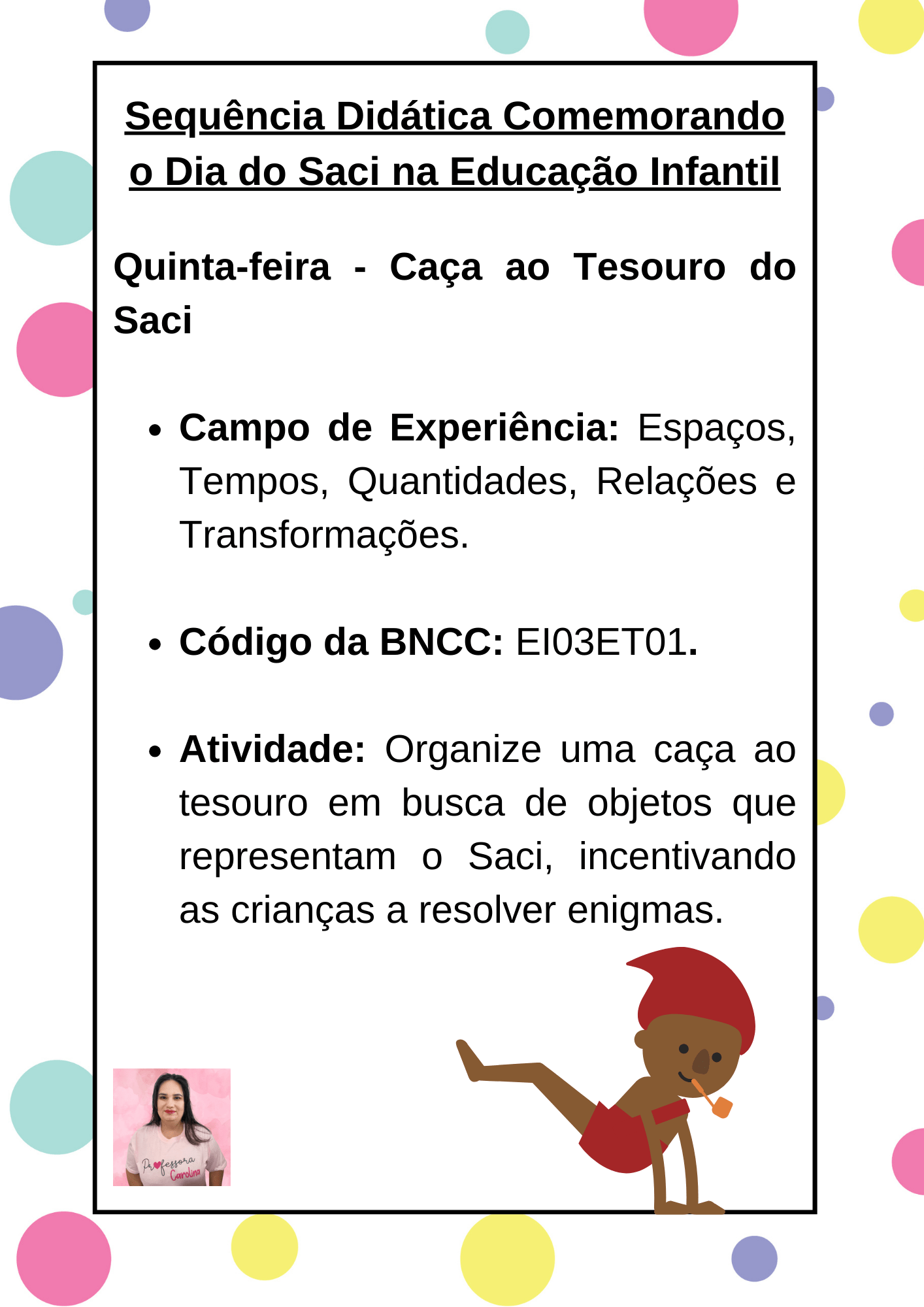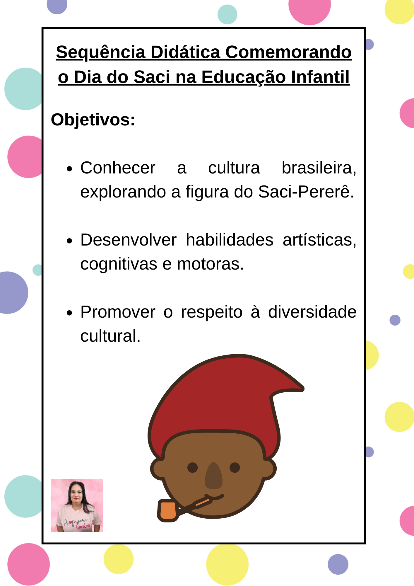 O Dia do Saci é uma celebração que nos conecta com nossas raízes culturais, proporcionando uma oportunidade incrível para as crianças na educação infantil explorarem nossa mitologia e tradições. Através de sequências didáticas com atividades lúdicas e artísticas, podemos inspirar o amor pela nossa cultura e a valorização de nossas histórias únicas. Ensinar o Dia do Saci não só enriquece o conhecimento das crianças, mas também fortalece nossa identidade como nação. Portanto, vamos comemorar esse dia especial, valorizando o que é nosso e enriquecendo o aprendizado das gerações futuras.