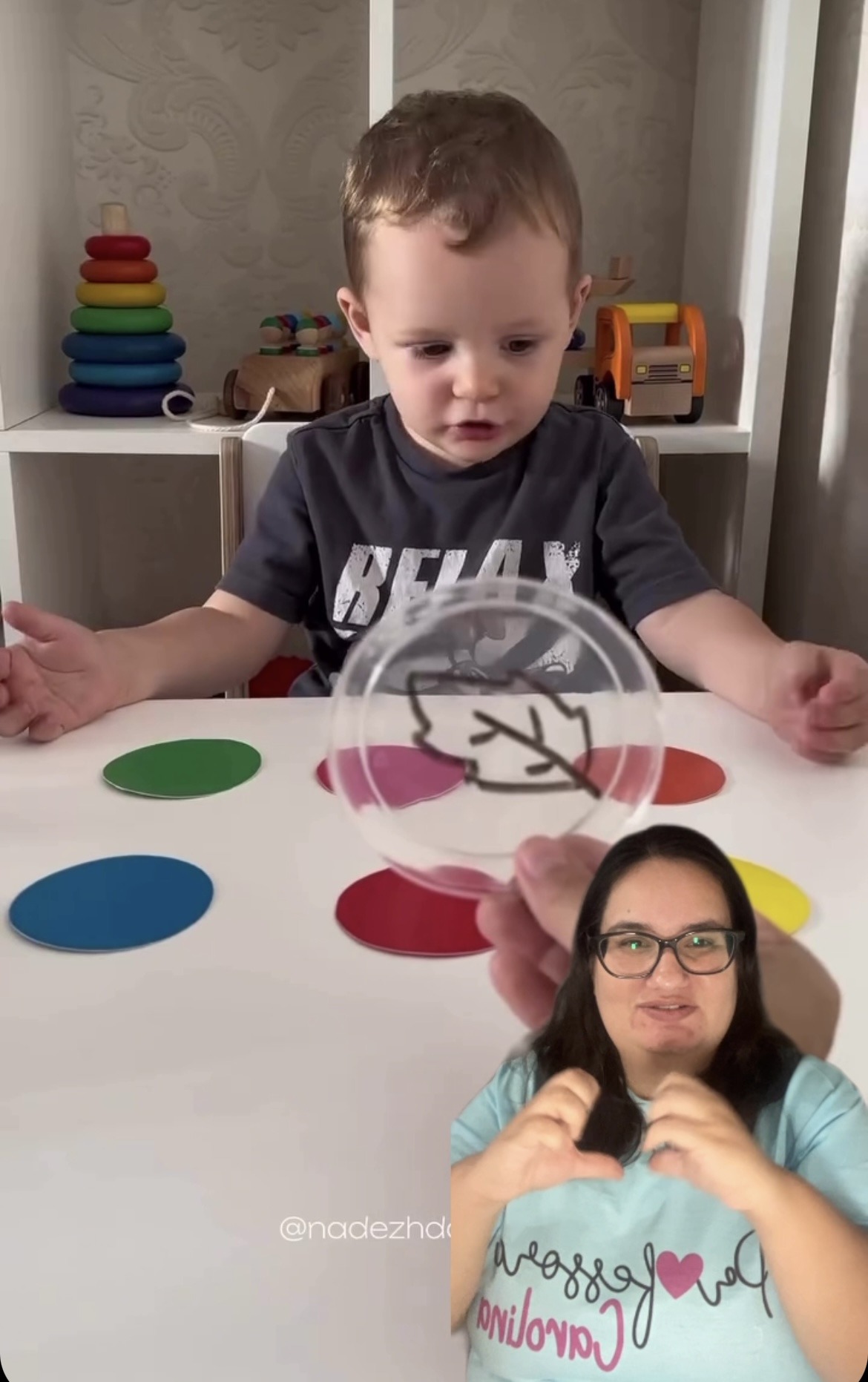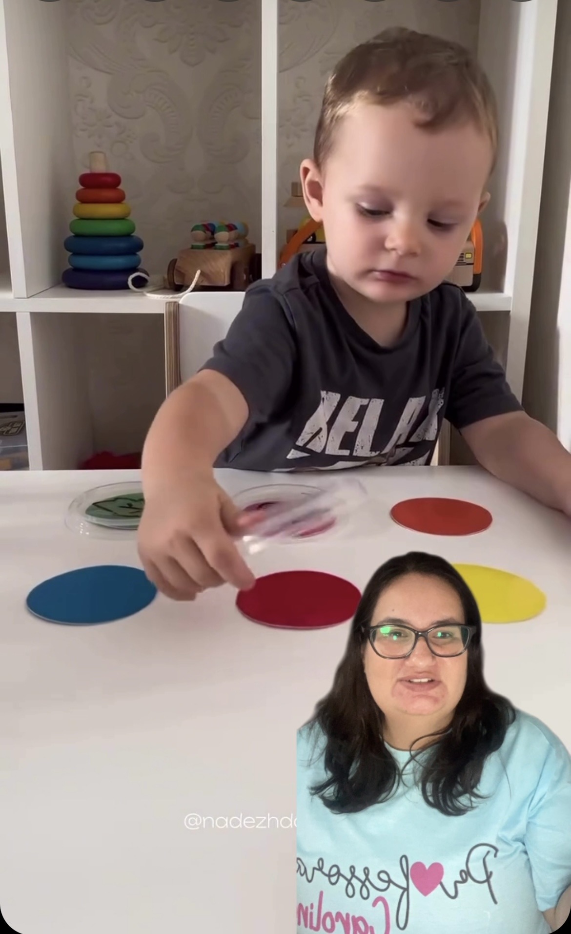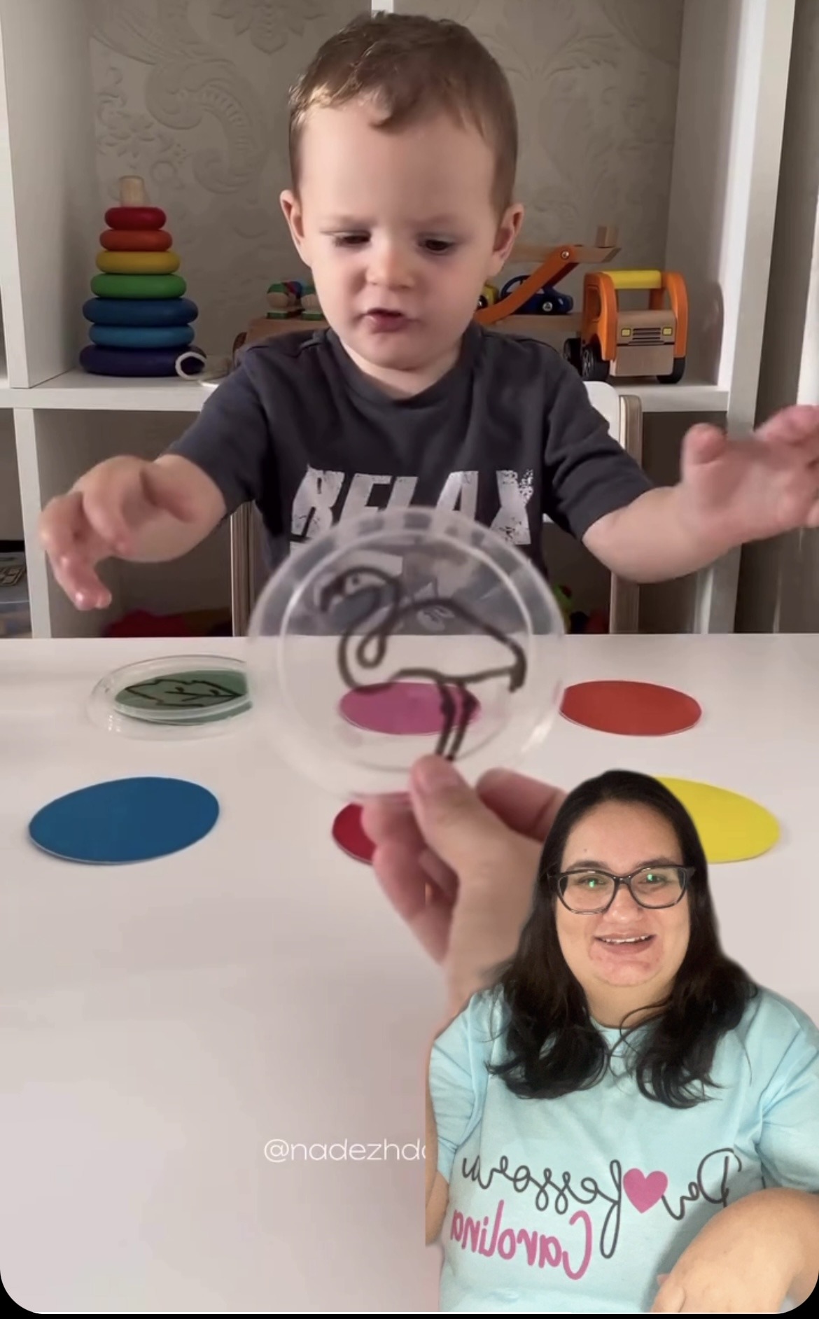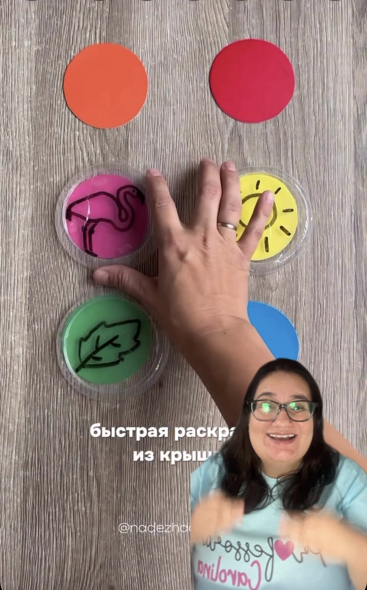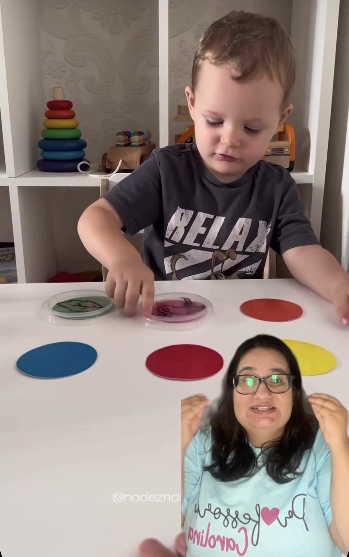 - Objetivo: a criança deve combinar as tampas com os círculos coloridos, associando cada cor ao desenho correspondente, como o sol amarelo ou a folha verde.