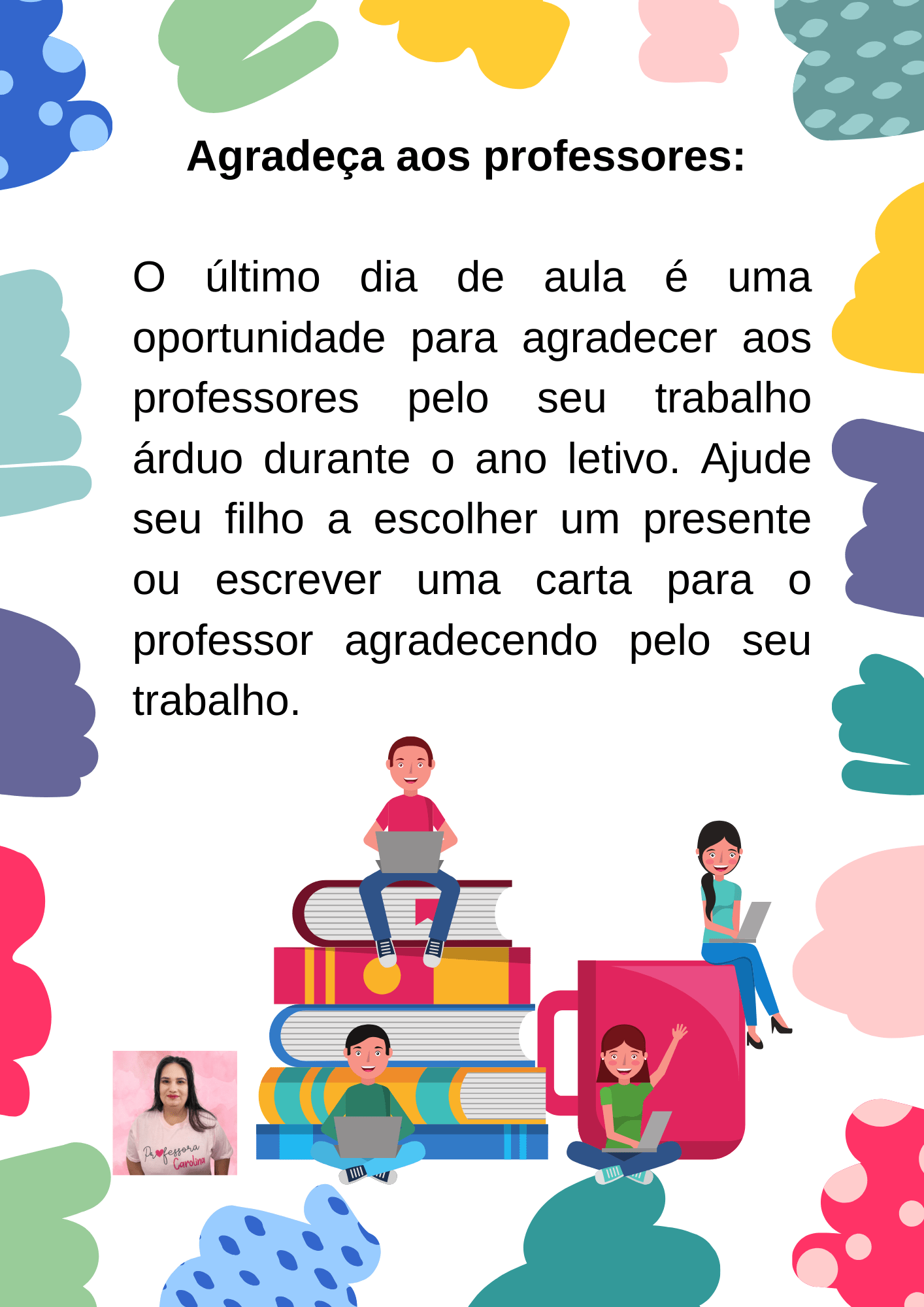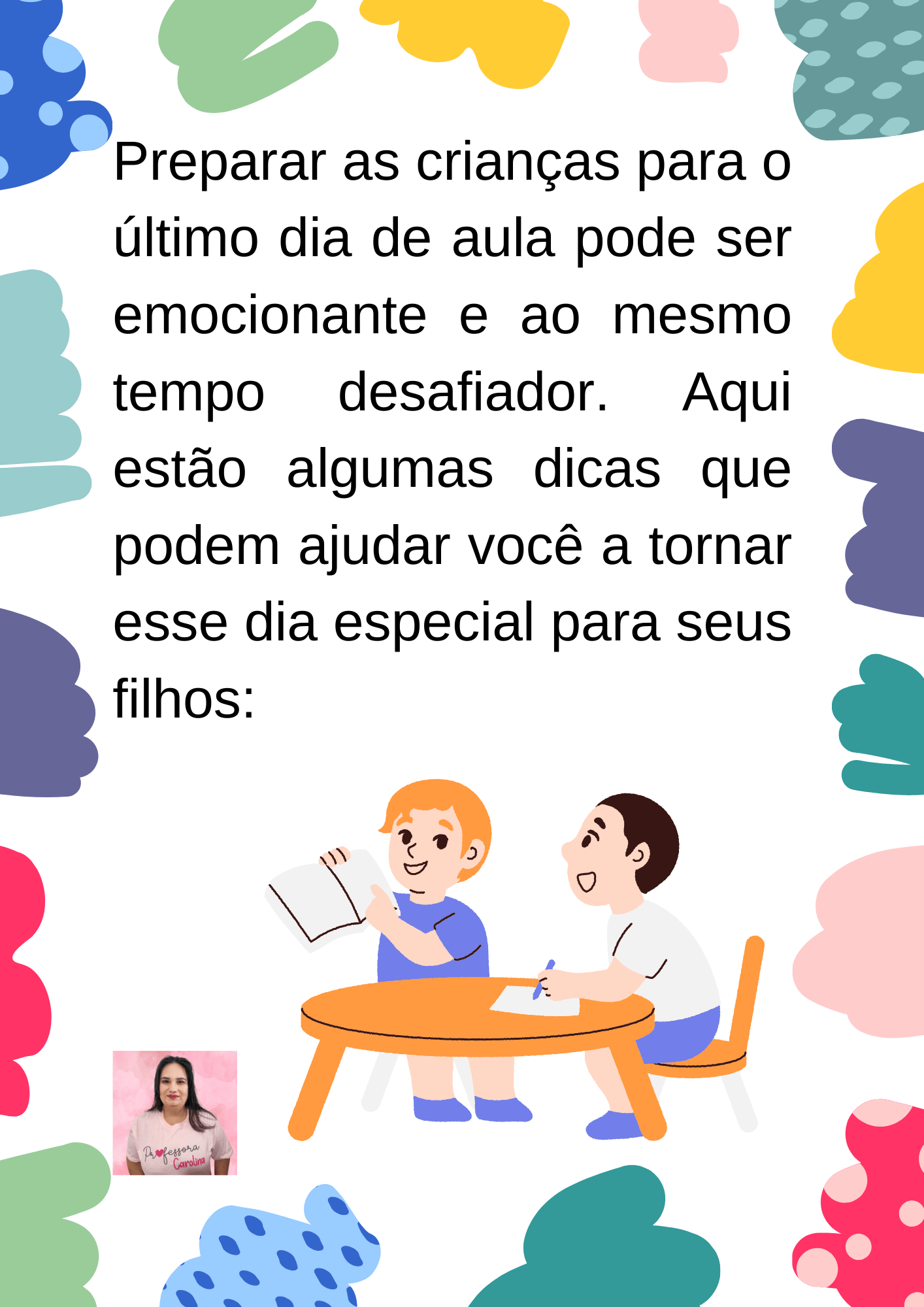 - Ajude as crianças a se despedirem dos professores. É importante que as crianças possam agradecer aos seus professores pelo ano letivo. Isso pode ser feito através de um cartão ou de uma pequena lembrança.