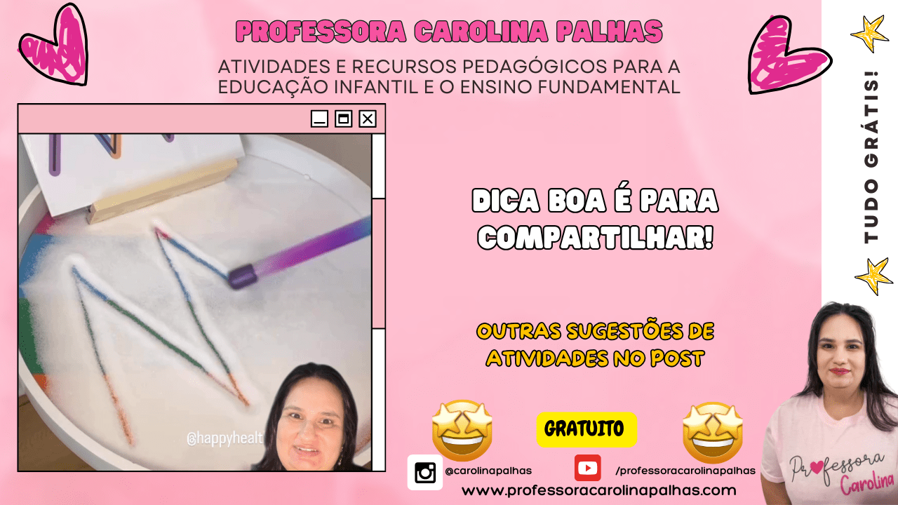 Palavras-chave: atividade sensorial, coordenação motora fina, percepção tátil, educação infantil, atividades pedagógicas, brincadeiras educativas, desenvolvimento infantil, aprender brincando, habilidades motoras, criatividade na educação, escrita criativa, exploração sensorial, ensino infantil, atividades com areia, escrita com areia.