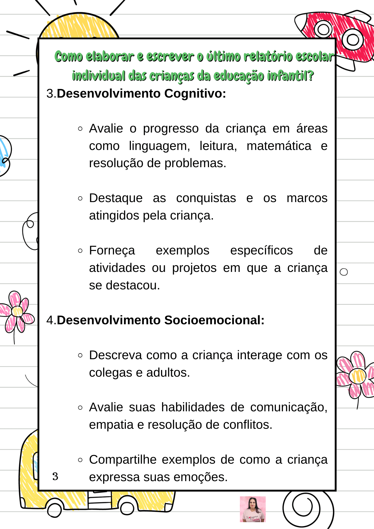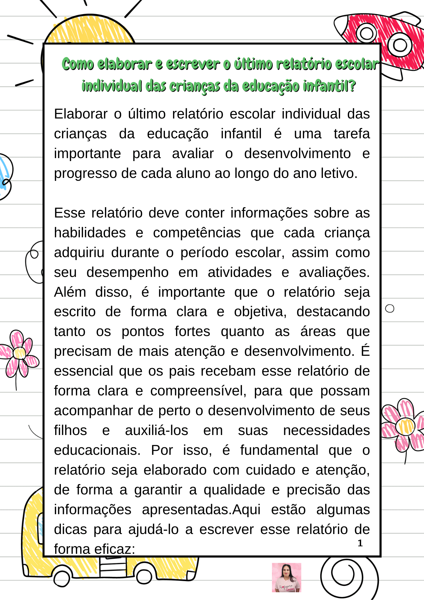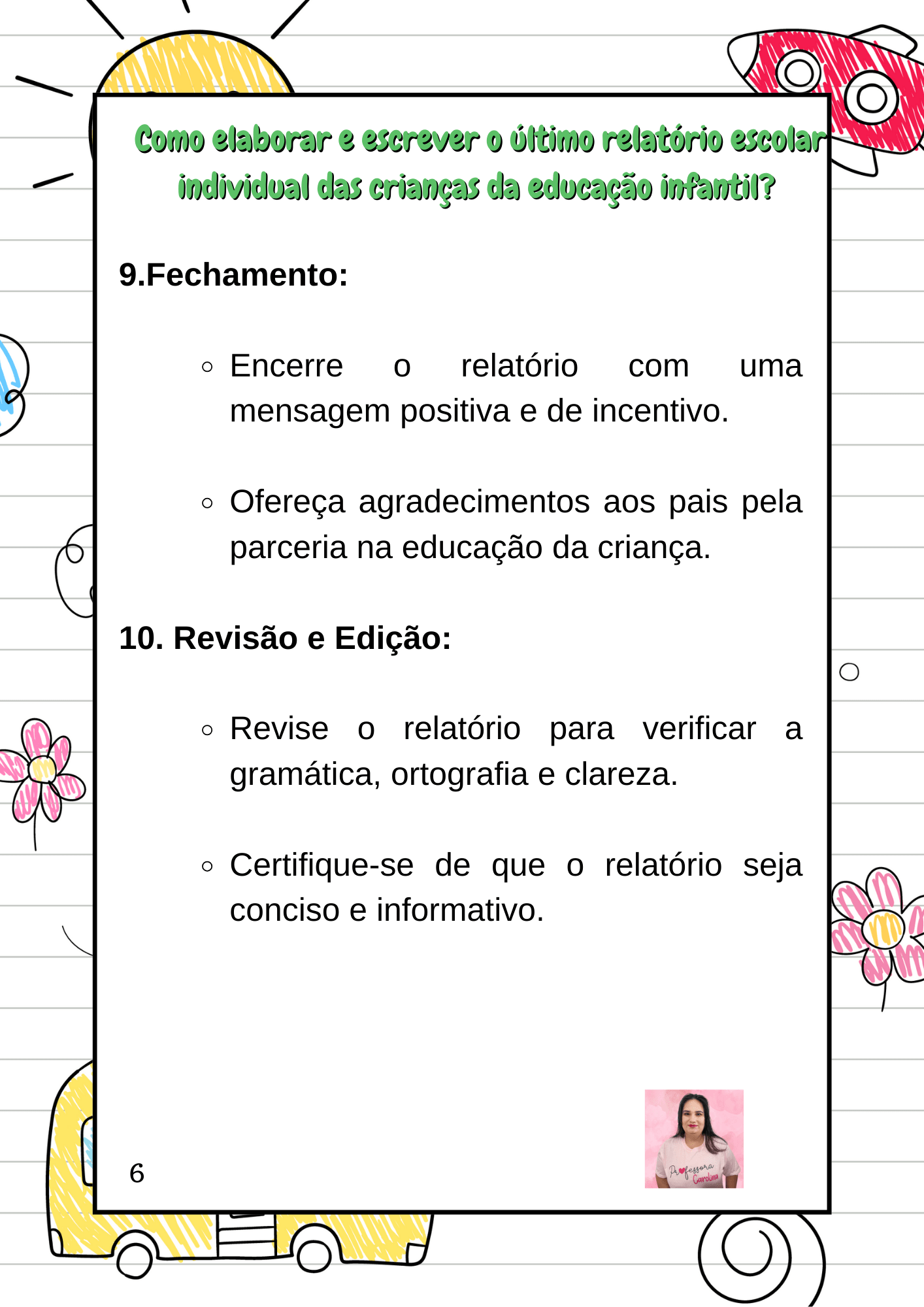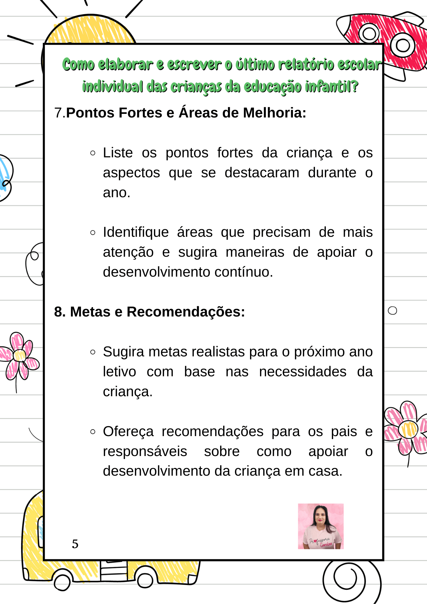 - Comunique-se com os Pais: Mantenha uma comunicação aberta com os pais ao longo do ano. Converse sobre o progresso, desafios e conquistas das crianças. Isso proporcionará insights valiosos para o relatório.