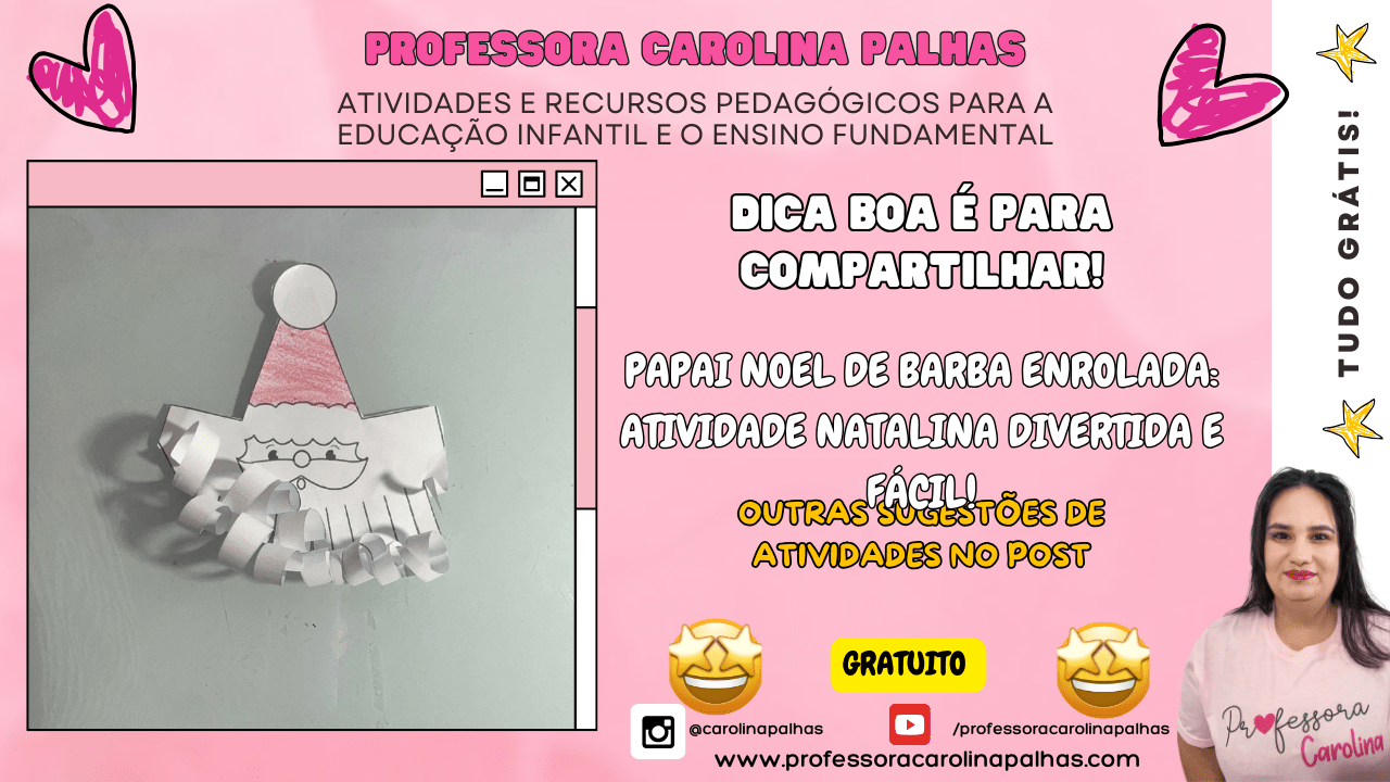 Legenda para o blog: Nesta atividade especial de Natal, as crianças vão criar um Papai Noel com uma barba cheia de cachinhos! Com um simples desenho e papel para enrolar, essa atividade é perfeita para desenvolver a coordenação motora fina e estimular a criatividade dos pequenos. Além disso, proporciona momentos de diversão enquanto as crianças personalizam seu próprio Papai Noel. Confira o passo a passo e aproveite para se inspirar com outras 15 sugestões de atividades natalinas criativas e fáceis de fazer com os alunos!