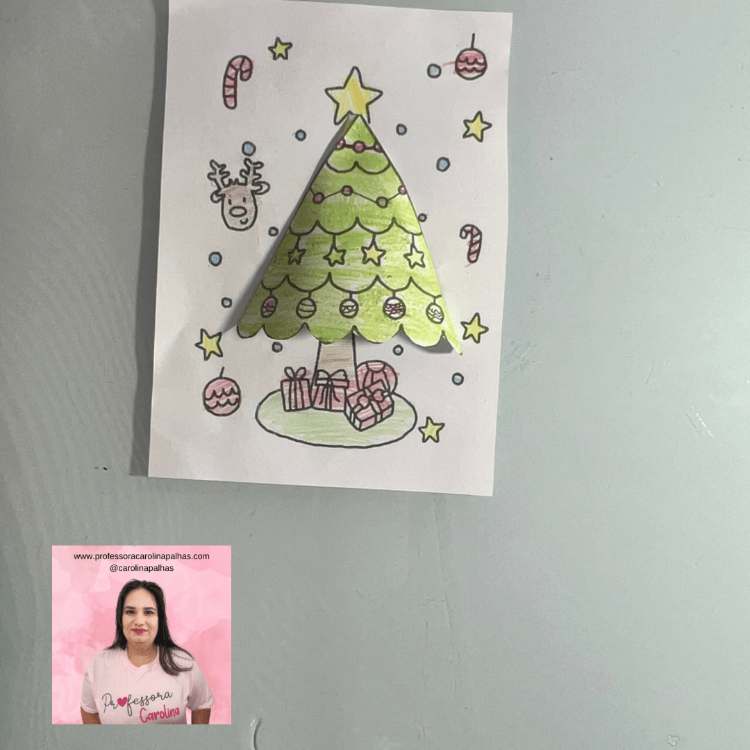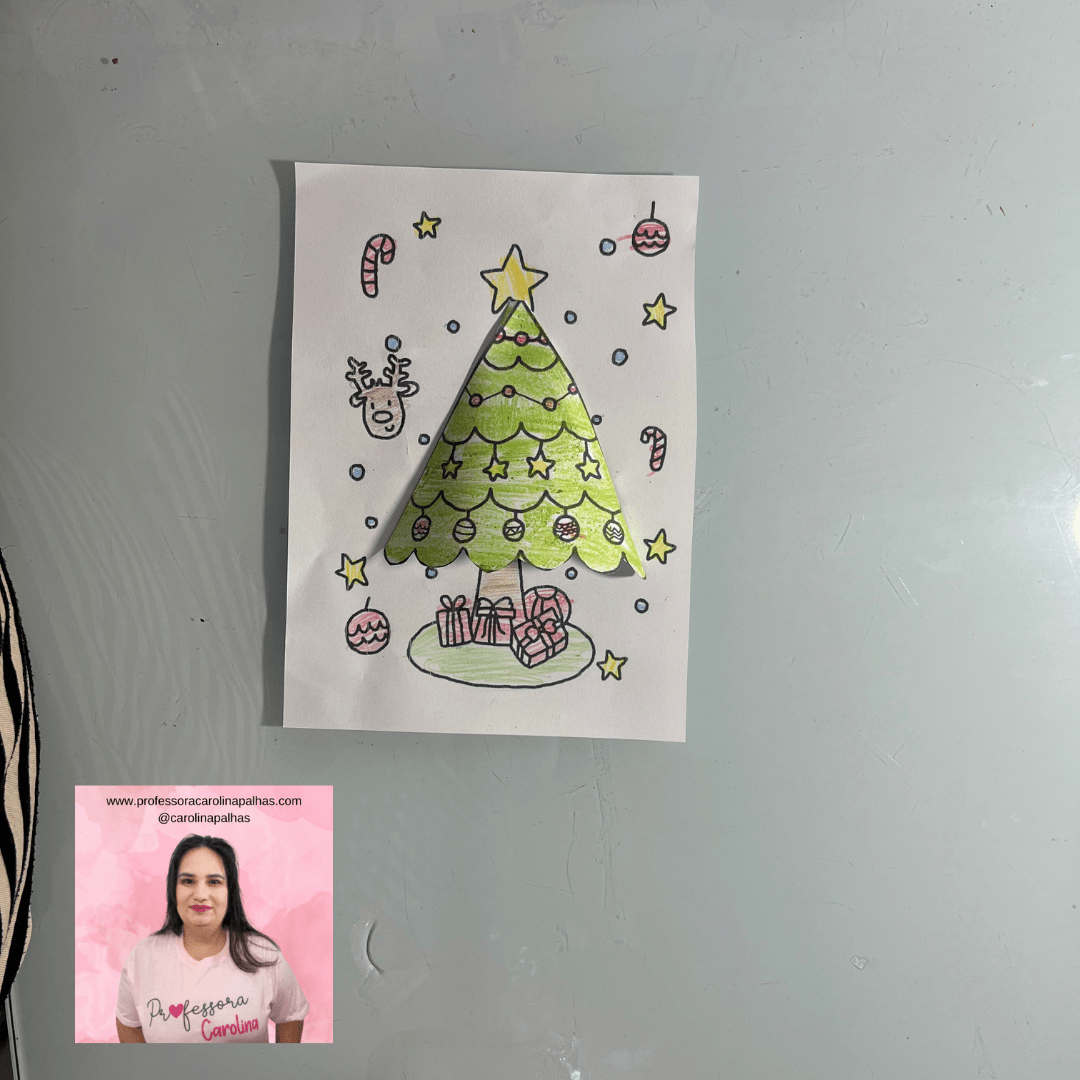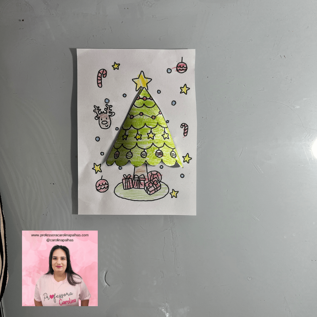 Legenda para o blog: Traga a magia do Natal para a sala de aula com esta atividade de Árvore de Natal 3D! Com um simples dobrado de papel, as crianças podem criar uma árvore que “salta” do papel, decorando-a com presentes, enfeites e muita criatividade. Essa atividade é excelente para estimular a coordenação motora e dar um toque natalino à sala de aula!