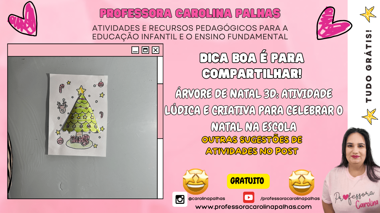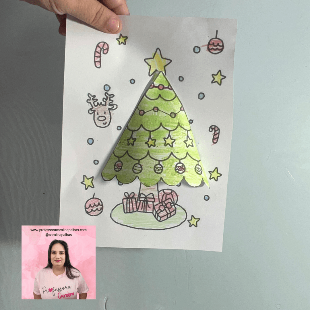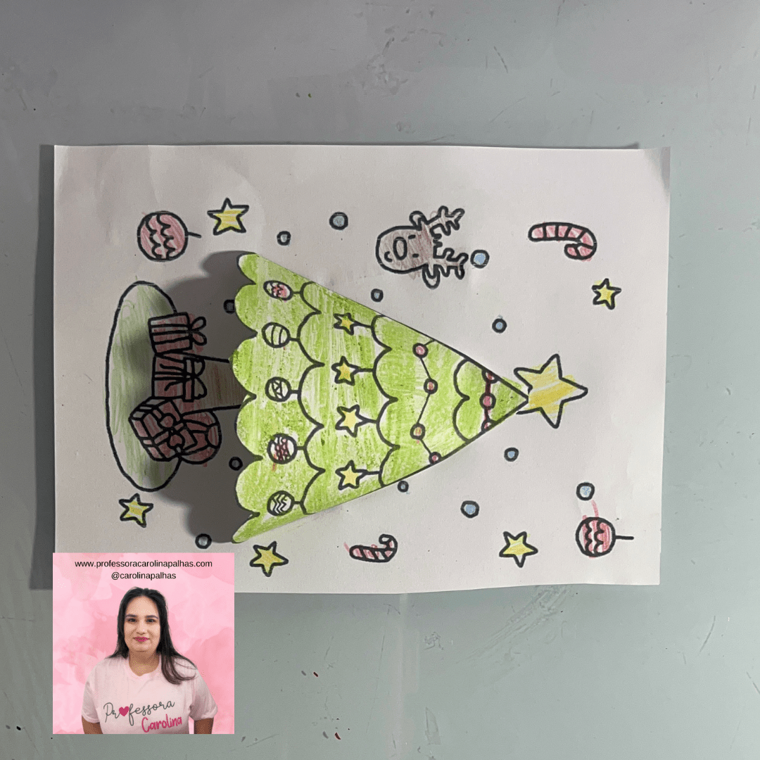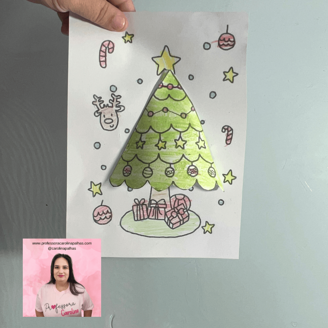 Legenda para o blog: Traga a magia do Natal para a sala de aula com esta atividade de Árvore de Natal 3D! Com um simples dobrado de papel, as crianças podem criar uma árvore que “salta” do papel, decorando-a com presentes, enfeites e muita criatividade. Essa atividade é excelente para estimular a coordenação motora e dar um toque natalino à sala de aula!