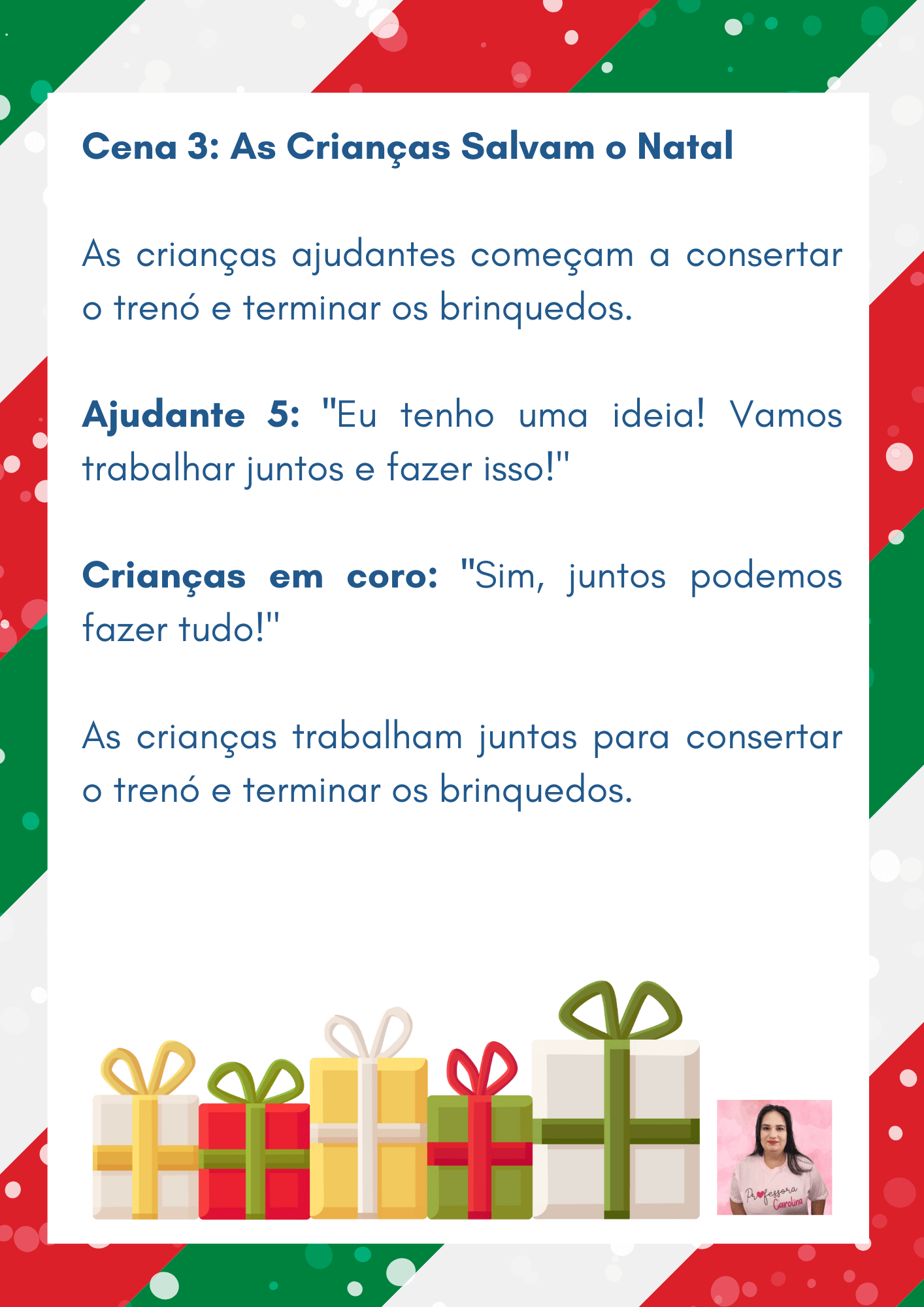 A história se inicia na efervescente Fábrica de Brinquedos do Papai Noel, onde os pequenos duendes trabalham incansavelmente para garantir que cada presente seja preparado a tempo para a grande noite de Natal. O roteiro destaca não apenas a alegria do Natal, mas também valores como cooperação, amizade e solidariedade, reforçando de maneira lúdica e envolvente importantes ensinamentos para os pequenos artistas.