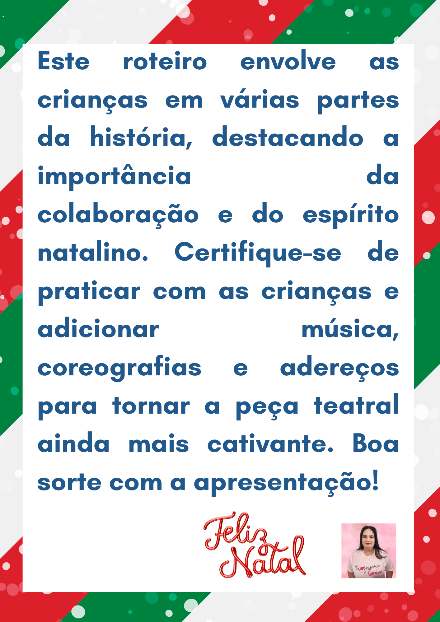 Os diálogos da peça são cuidadosamente elaborados para cativar a atenção das crianças e dos espectadores. Expressões simples e divertidas são incorporadas, permitindo que os pequenos atores se identifiquem com os personagens e mergulhem na magia do enredo. O texto também é pontuado por canções animadas que elevam o clima festivo, envolvendo a plateia em uma atmosfera contagiante.