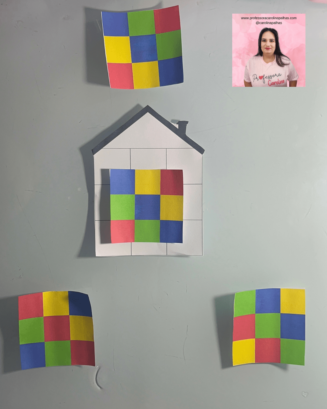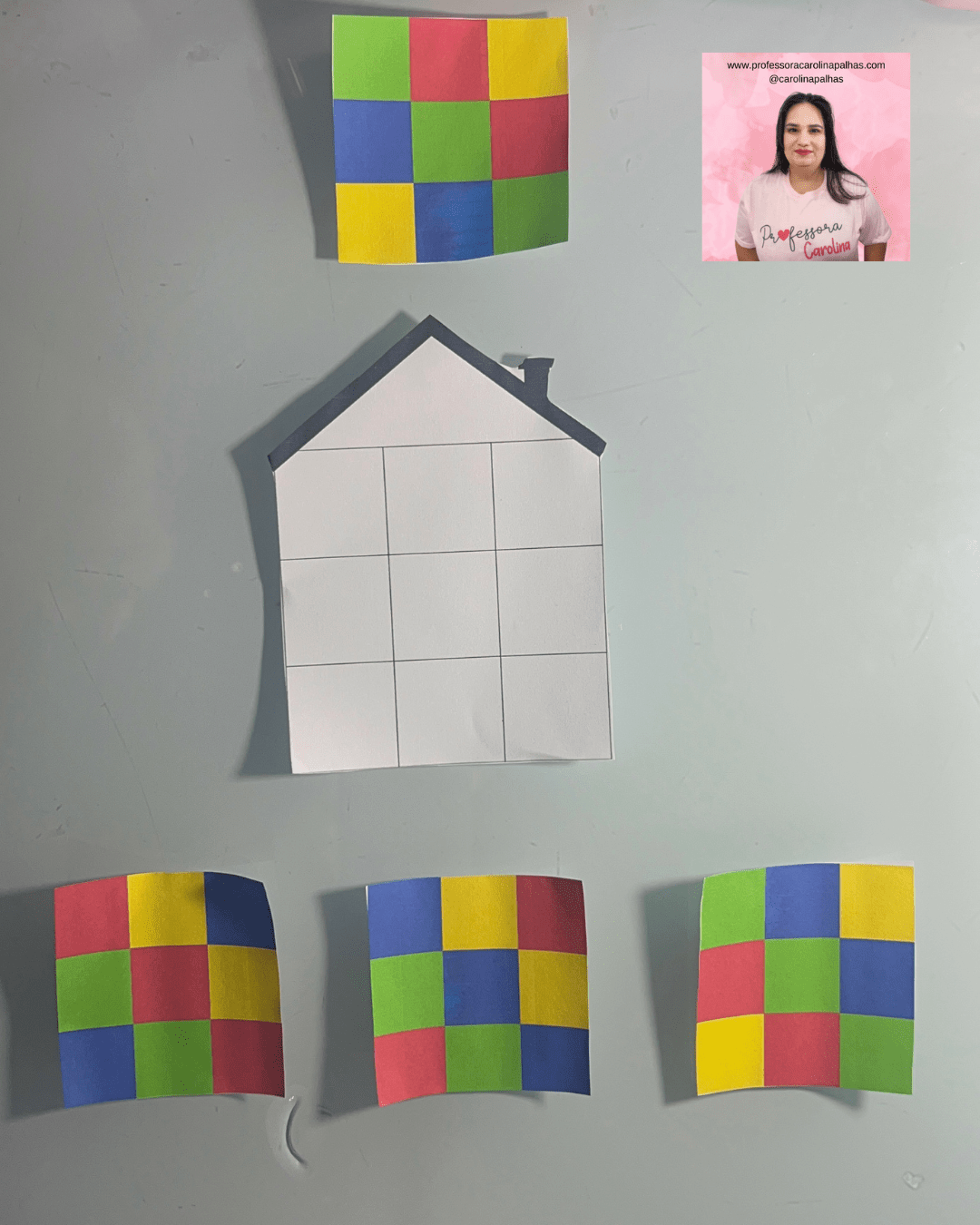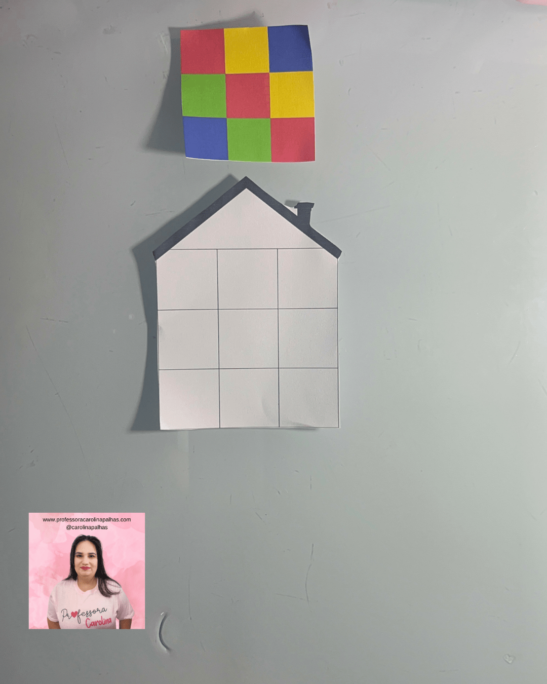 - Imprima o modelo da casa com espaços em branco e os quadrados coloridos com padrões pré-definidos.