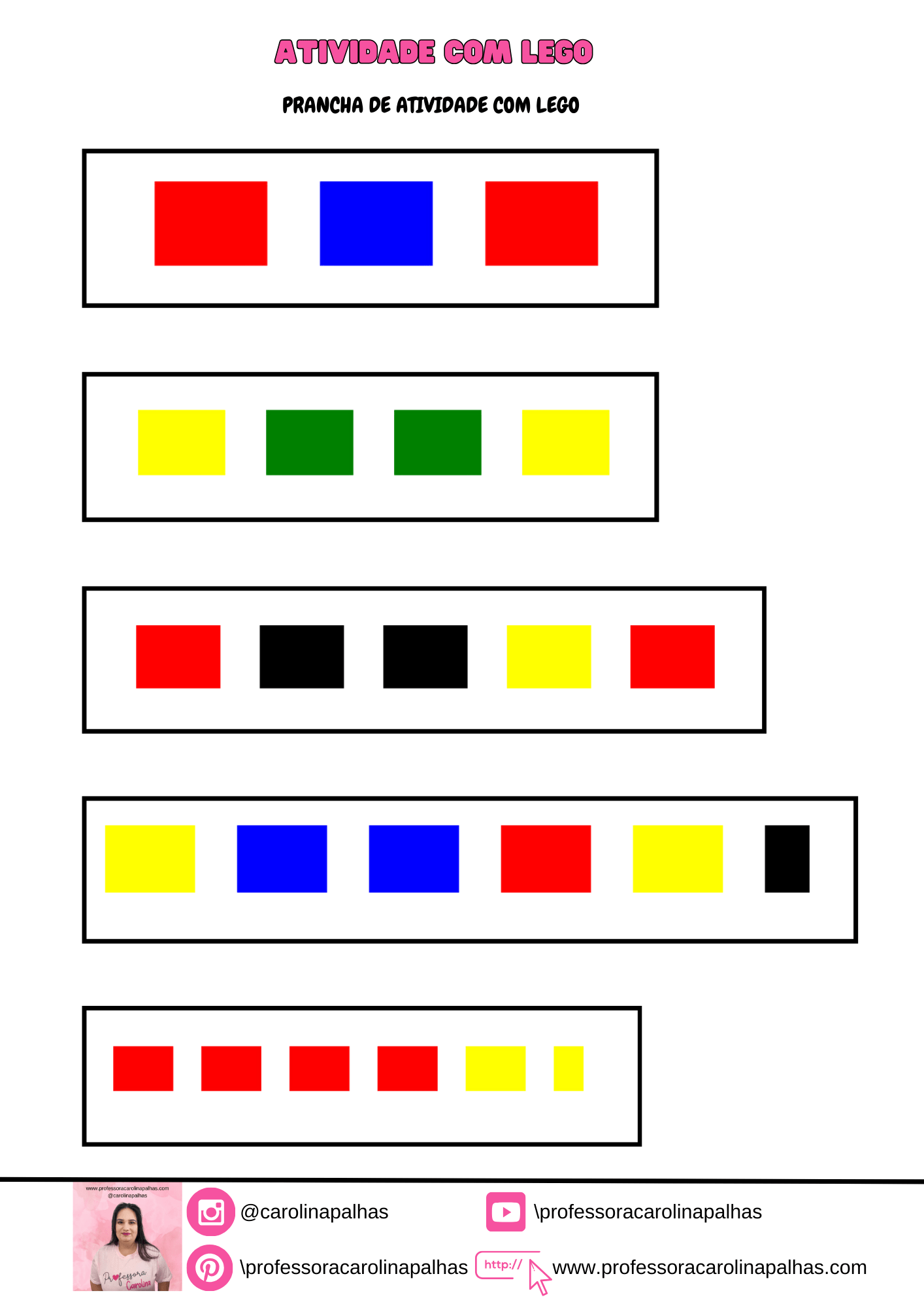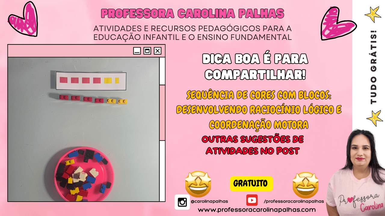 Palavras-chave: sequência de cores, atividade educativa, blocos de montar, coordenação motora, raciocínio lógico, percepção visual, brincadeiras pedagógicas, desenvolvimento infantil, educação infantil, habilidades motoras, cores e padrões, ensino lúdico, crianças, aprendizado criativo, atividades práticas.