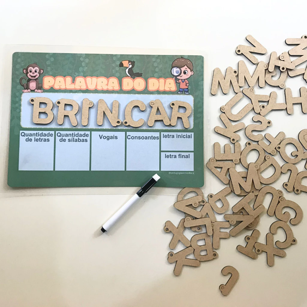 • Atividade: Peça às crianças que organizem as letras da “Palavra do Dia” na ordem correta usando letras móveis.