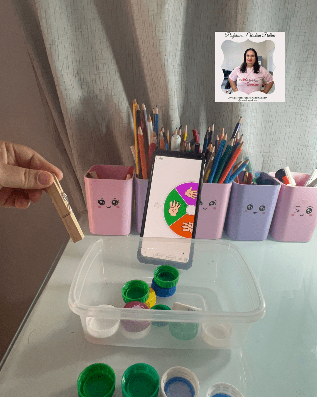 • Atividade: Utilize pregadores para as crianças pegarem tampinhas coloridas, associando-as às cores sorteadas na roleta.
