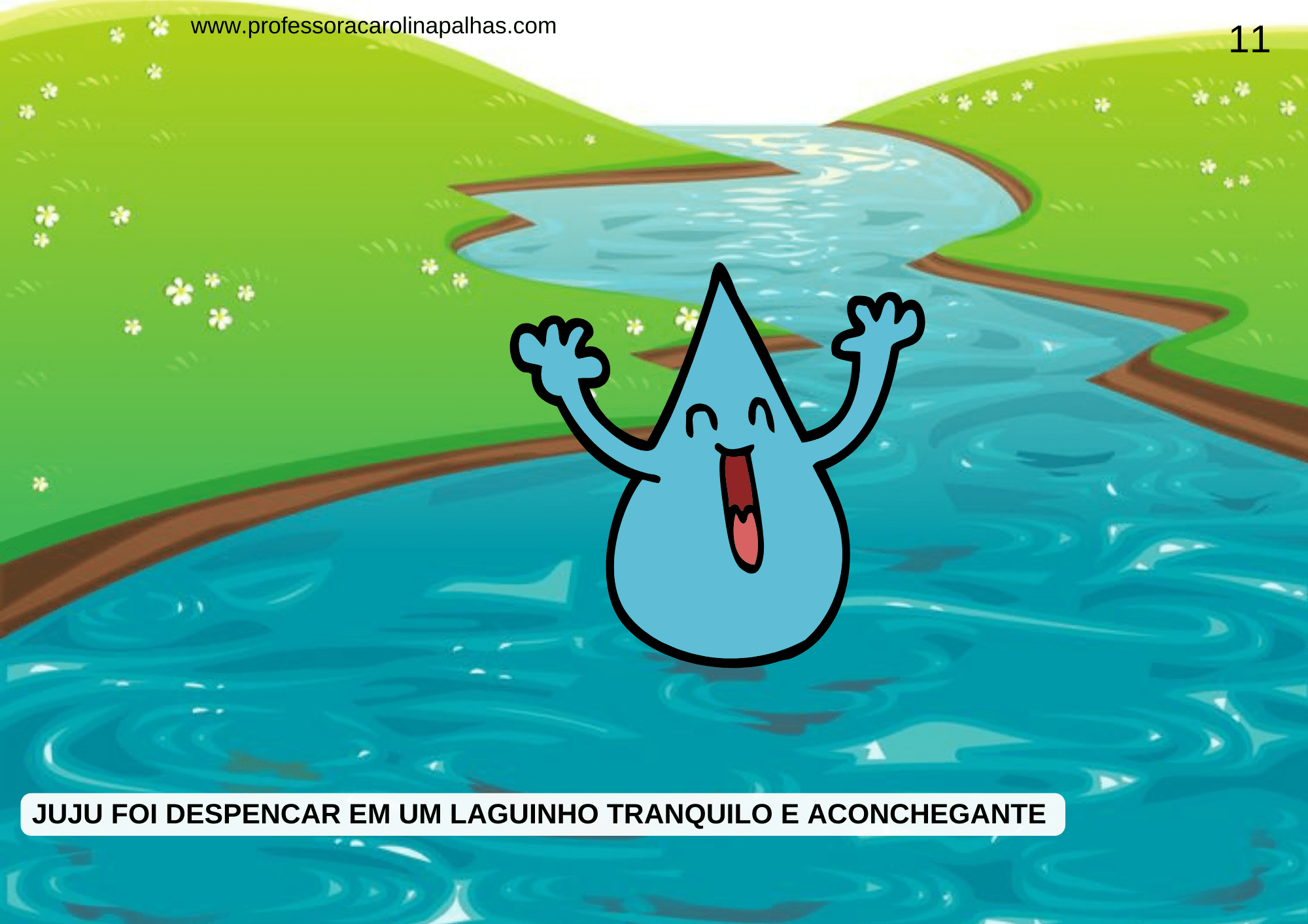 2. O professor conta a história e, quando uma fase é mencionada, as crianças com esse cartão levantam e imitam a ação (subir, virar nuvem, chover, correr para os rios).