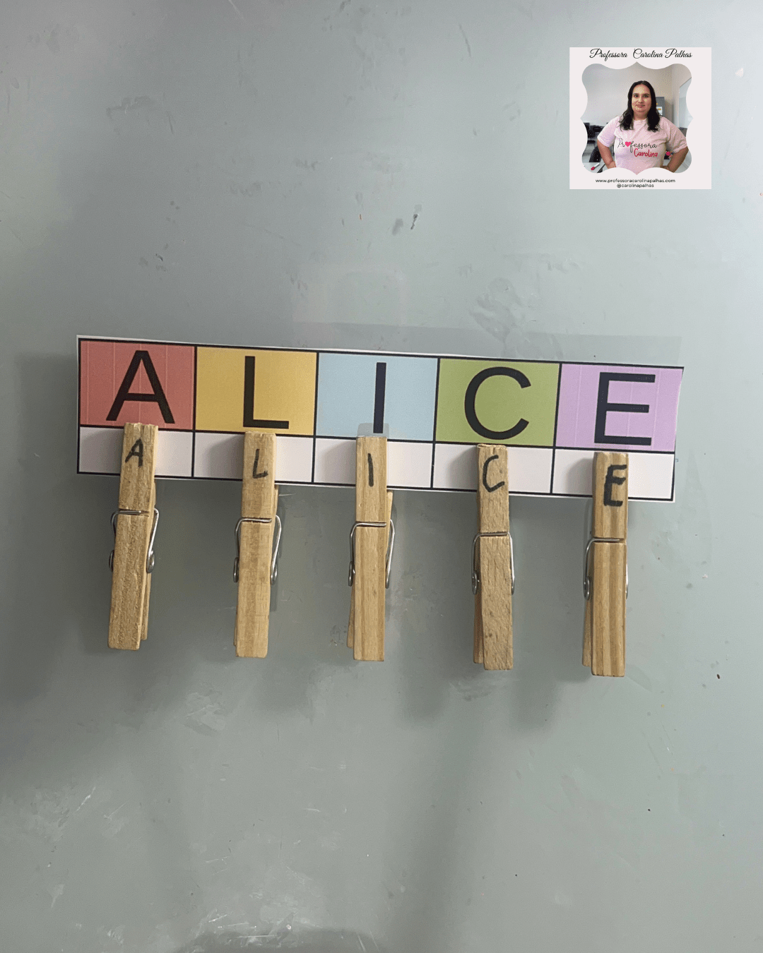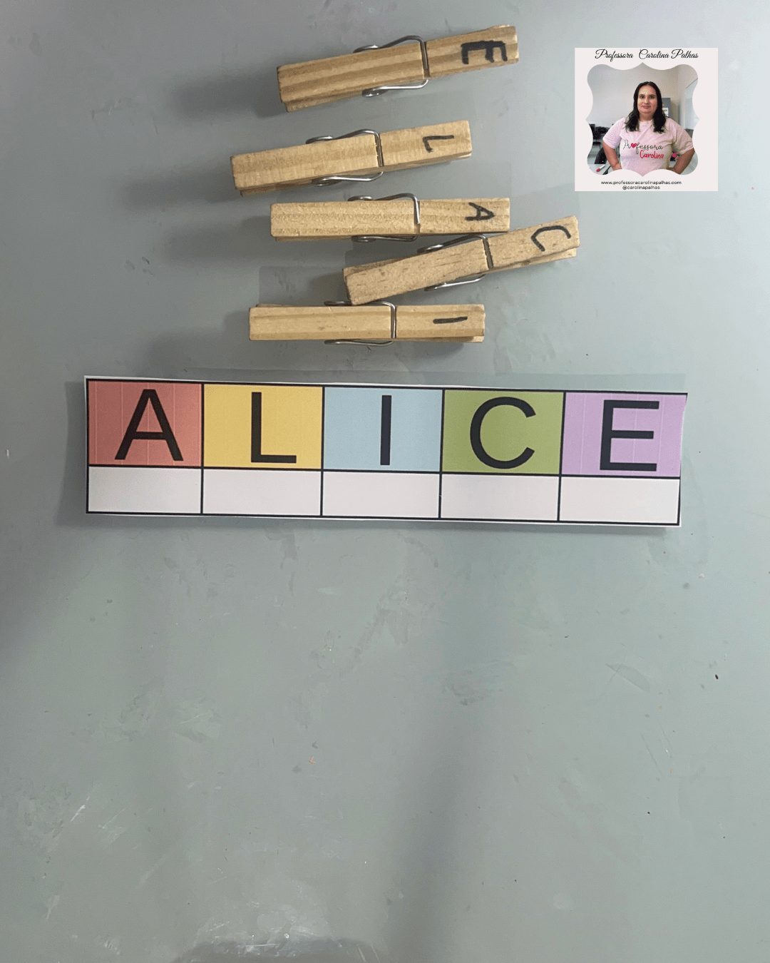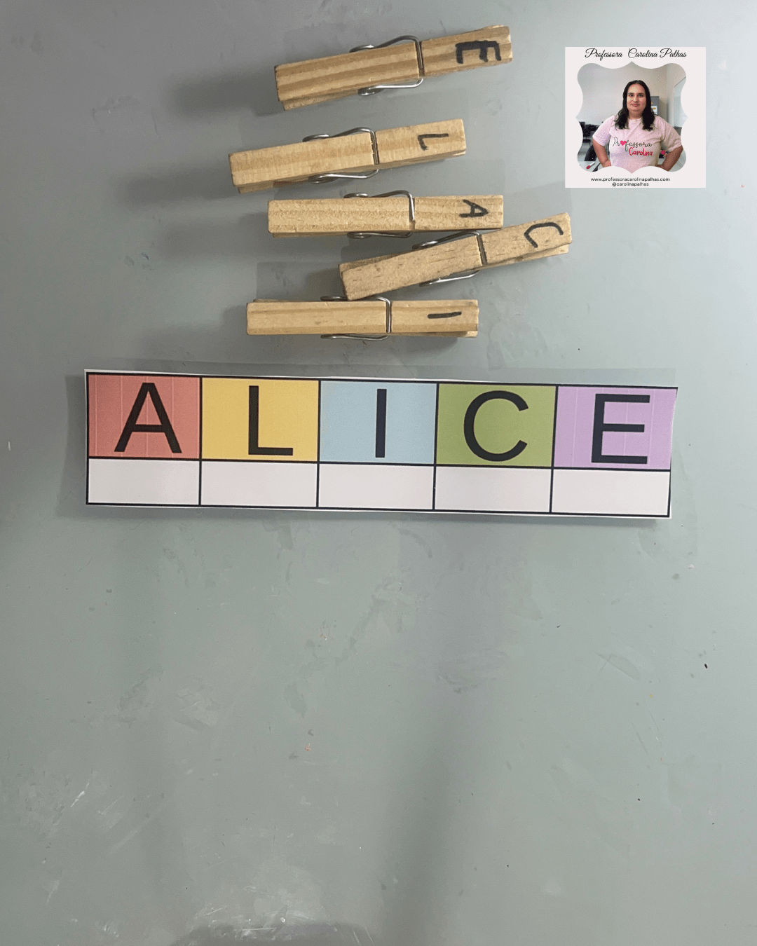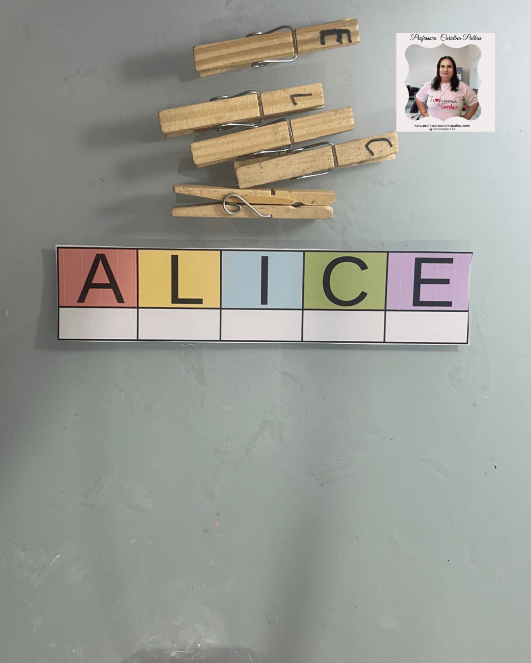 - A professora espalha as letras dos prendedores pela sala.