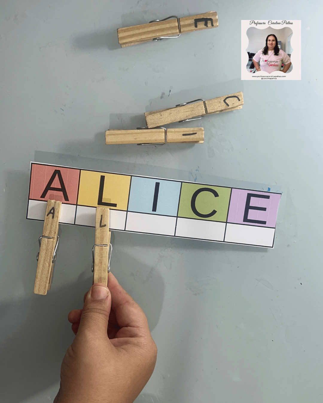 - Introduzir os prendedores com as letras do nome e a cartela.