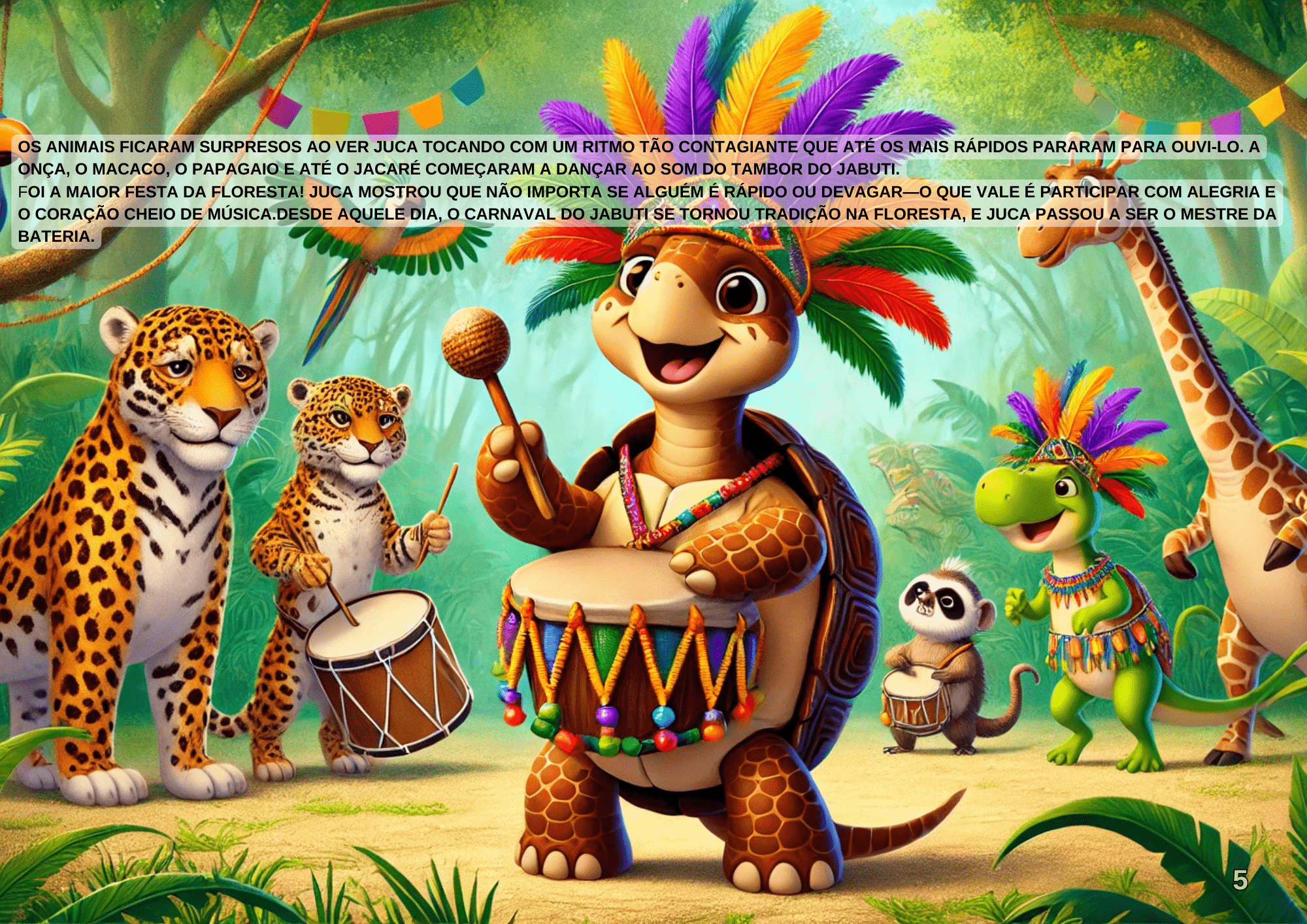 A história conta sobre um jabuti chamado Juca, que mora na floresta e adora tocar tambor. Todos os anos, os animais organizam um grande carnaval, mas sempre zombam de Juca por ser lento e dizem que ele não conseguiria acompanhar a festa. Determinado a provar que a alegria do carnaval não depende de velocidade, mas sim do coração, Juca cria seu próprio tambor e ensaia todos os dias. Quando chega o grande dia, sua batucada é tão contagiante que todos começam a dançar ao seu ritmo. Assim, o jabuti se torna o mestre da bateria do carnaval da floresta!