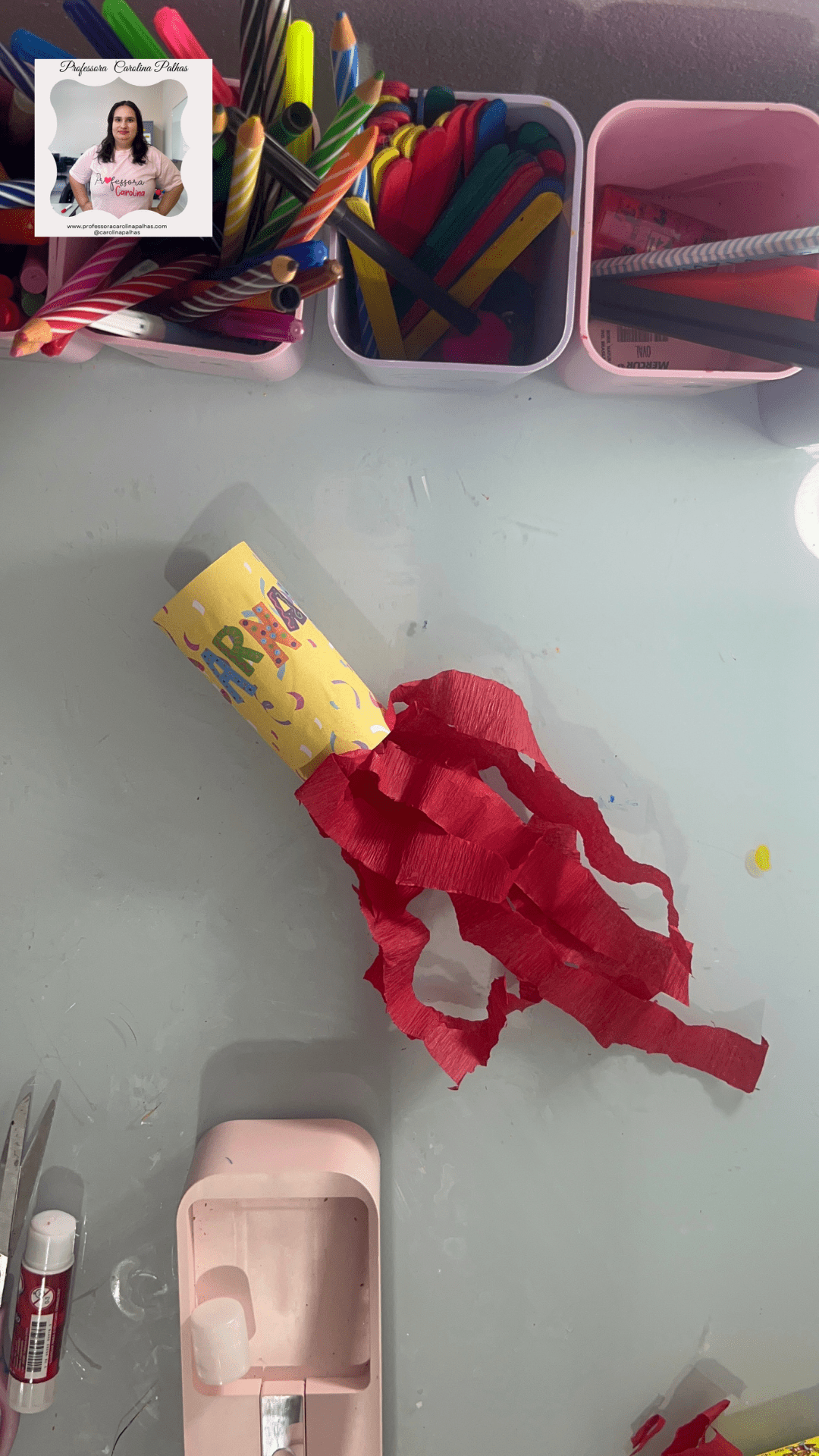 🎨 Descrição: Cada criança recebe um rolo de papelão e materiais para decorá-lo. Elas exploram as texturas da tinta, papel colorido e fitas.