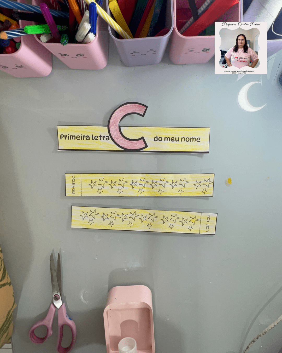 • As crianças montam seu nome com letras móveis (impressas, de EVA ou madeira).