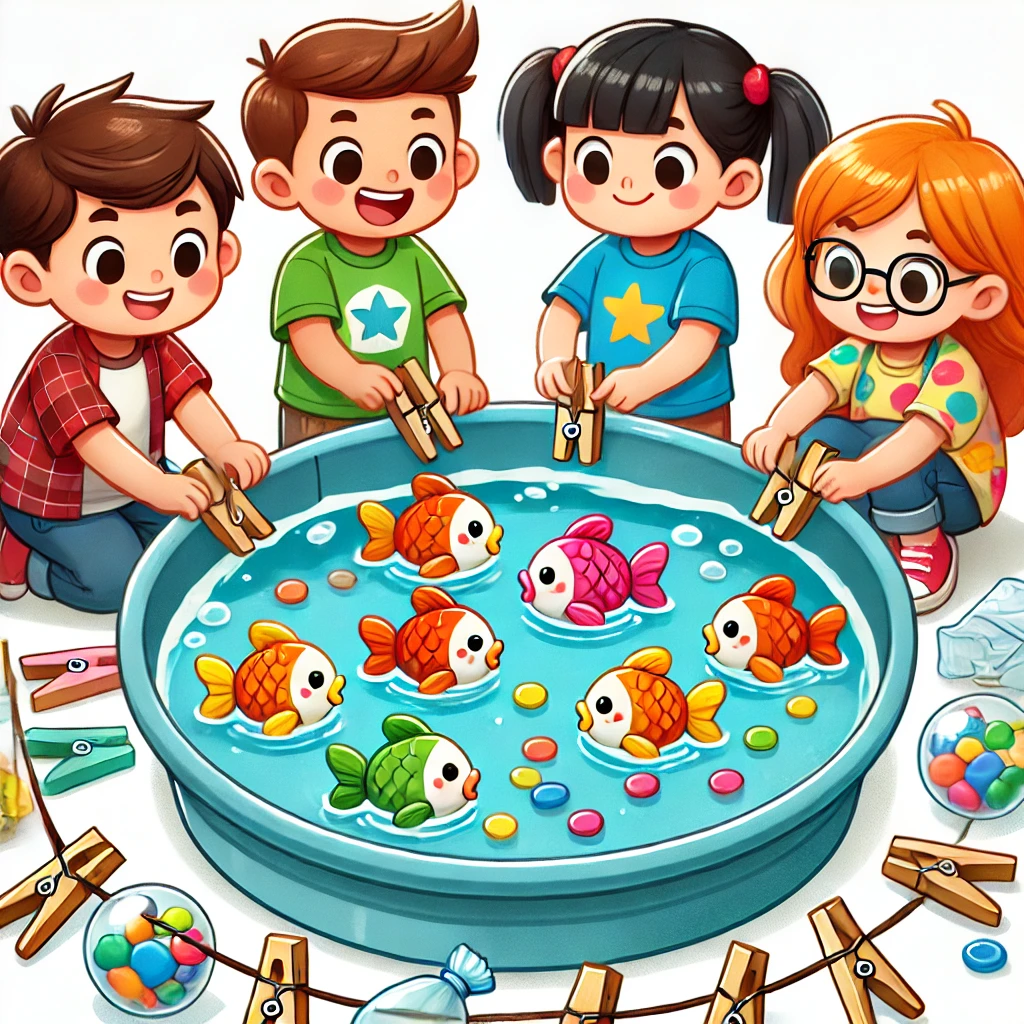 🔹 3. Hora da limpeza! Entregue um pregador de roupa para cada criança ou grupo e explique que elas serão “salvadores dos peixinhos”! Elas devem retirar os lixos da água, um por um, e colocá-los em um recipiente separado.